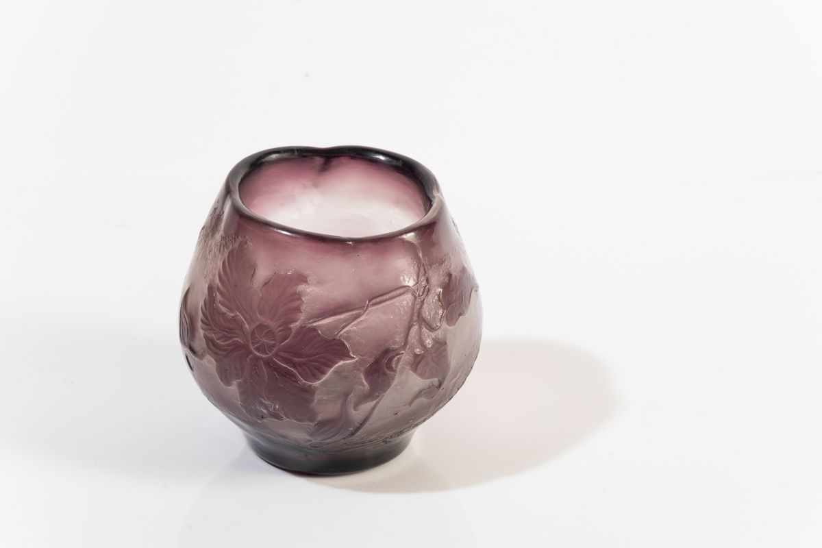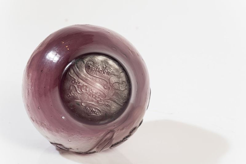 Raro vaso globulare serie Ametiste con collo quadrilobato in vetro a cammeo con decoro floreale.