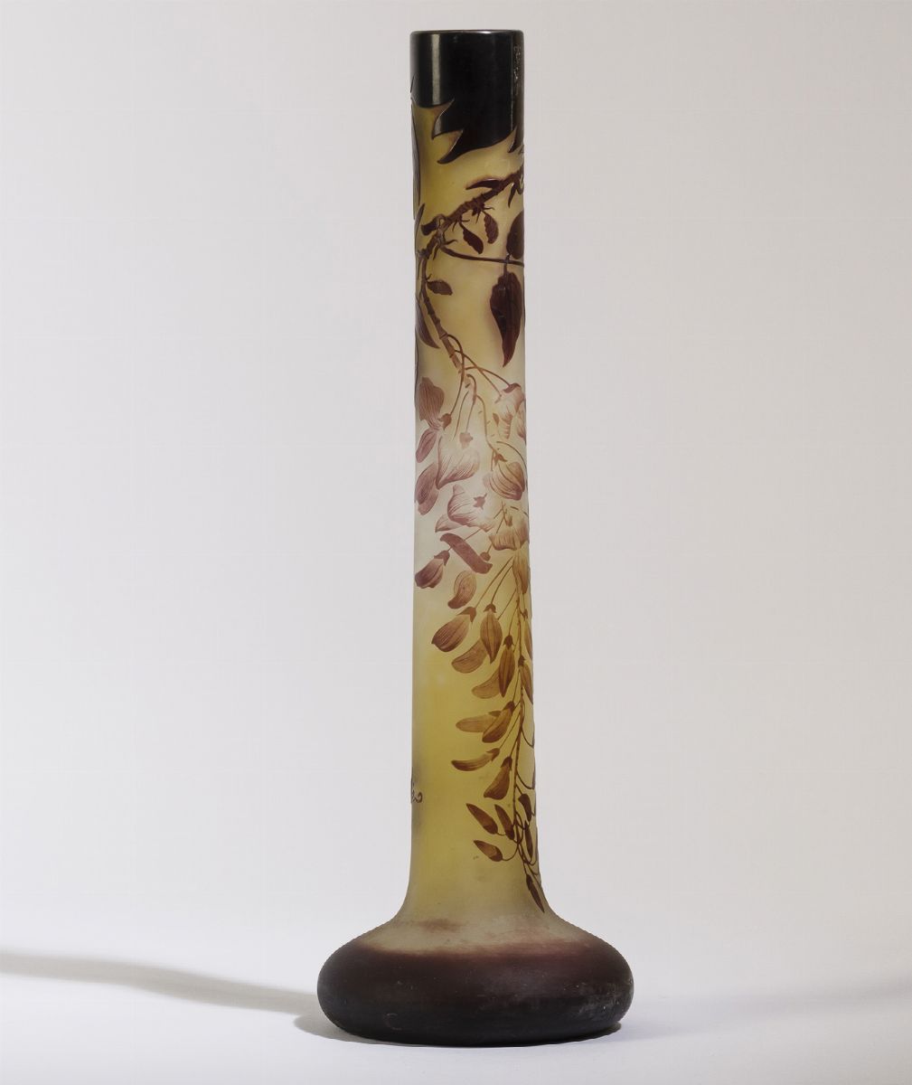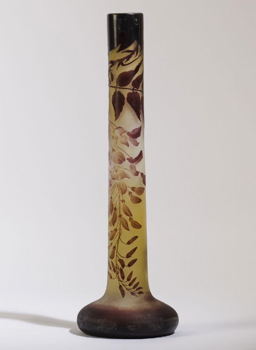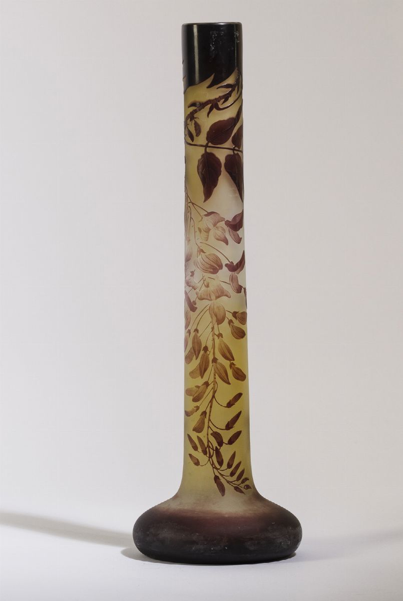 Grande vaso a clava in vetro a cammeo con decoro floreale di glicini.