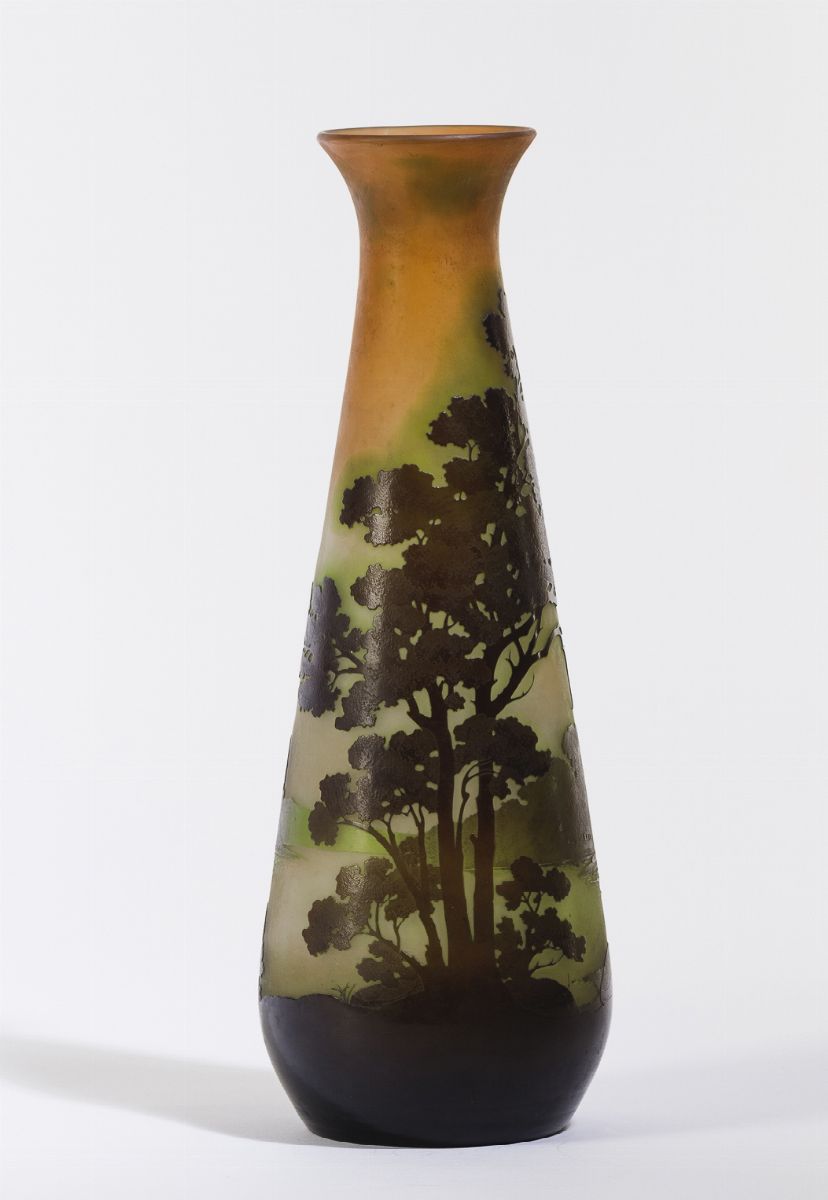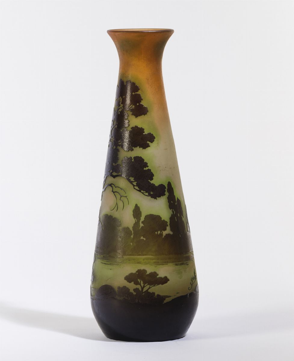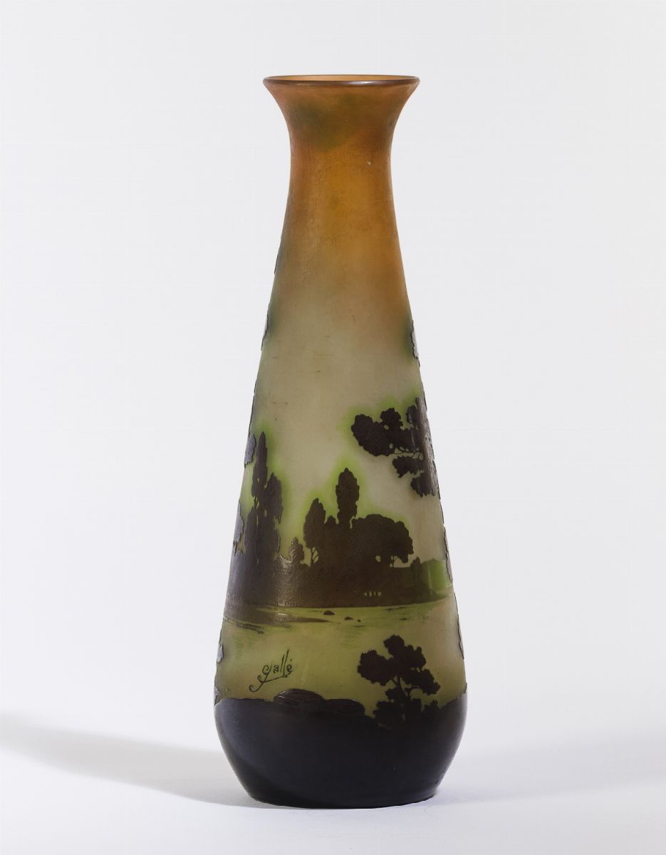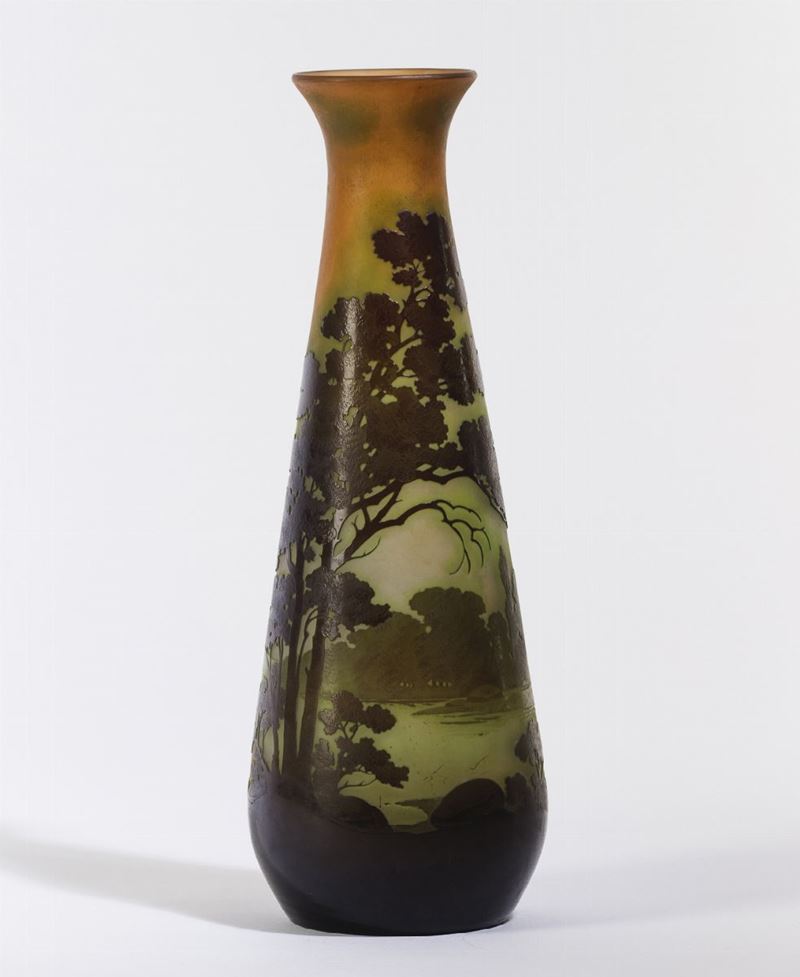 Vaso troncoconico in vetro a cammeo con decoro di paesaggio lacustre.
