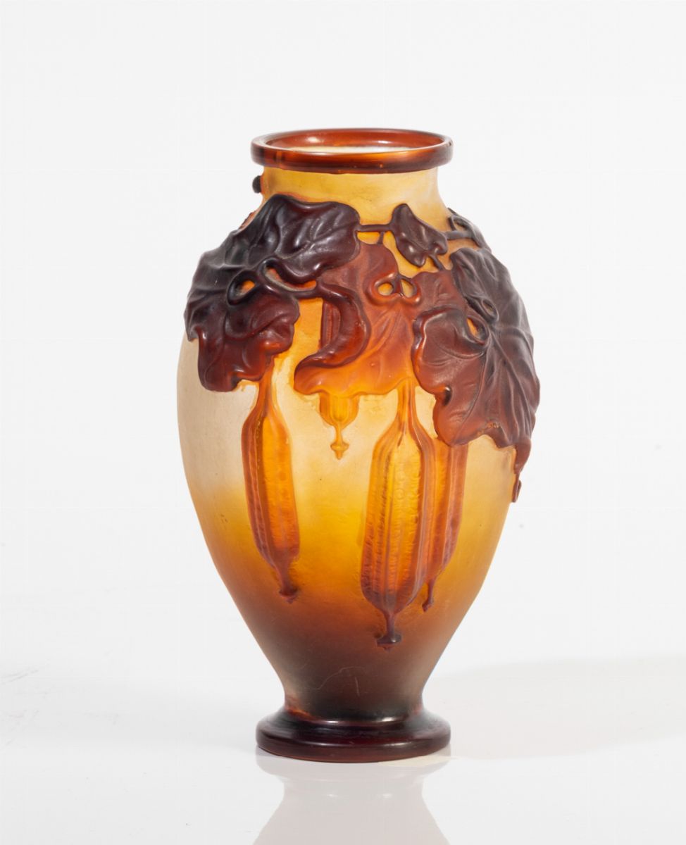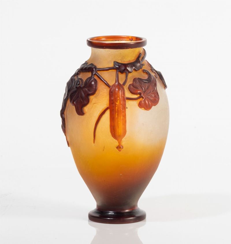 Raro vaso Soufflé in vetro soffiato a cammeo e a forte rilievo raffigurante foglie e zucche orientali.