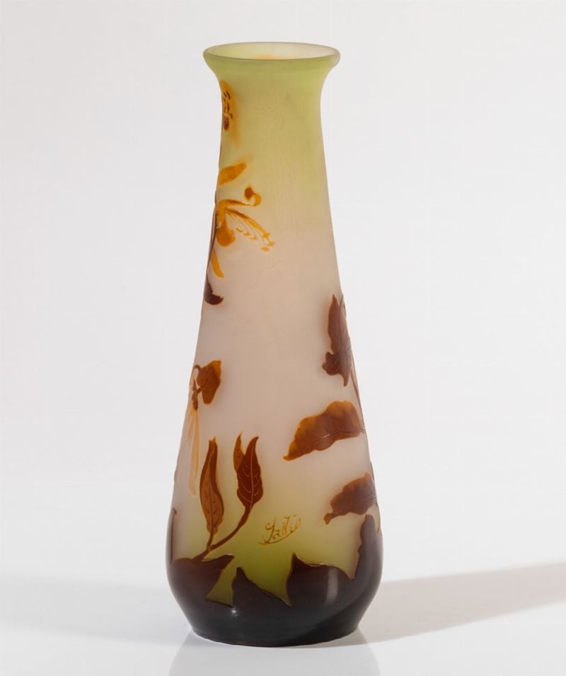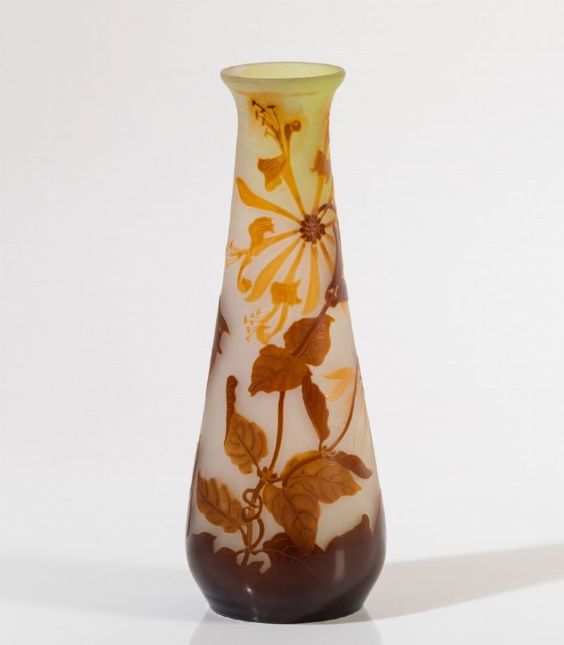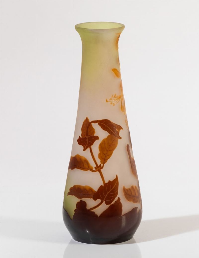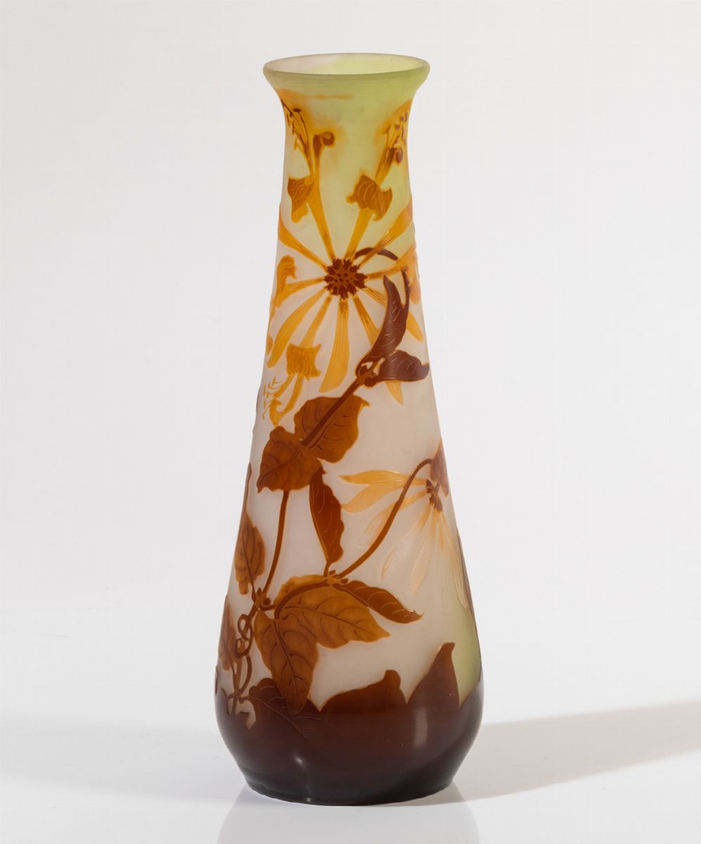 Vaso troncoconico in vetro con decoro floreale a cammeo.