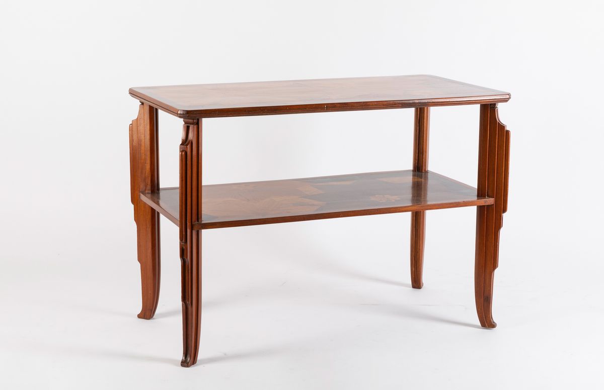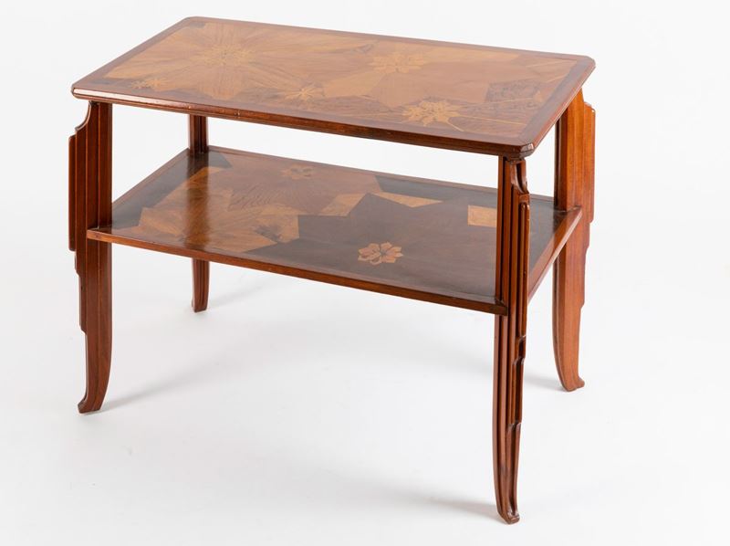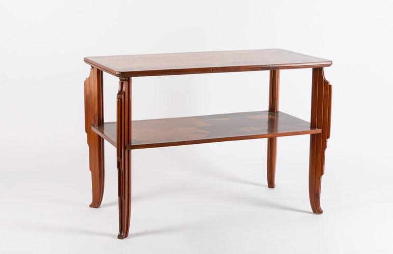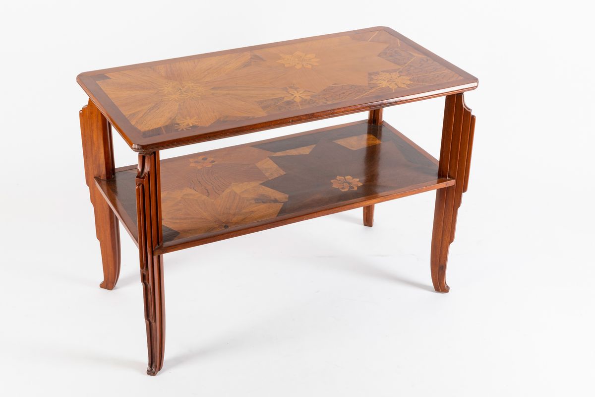 Tavolino rettangolare in stile Decò a due ripiani interamente intarsiato a motivi floreali.