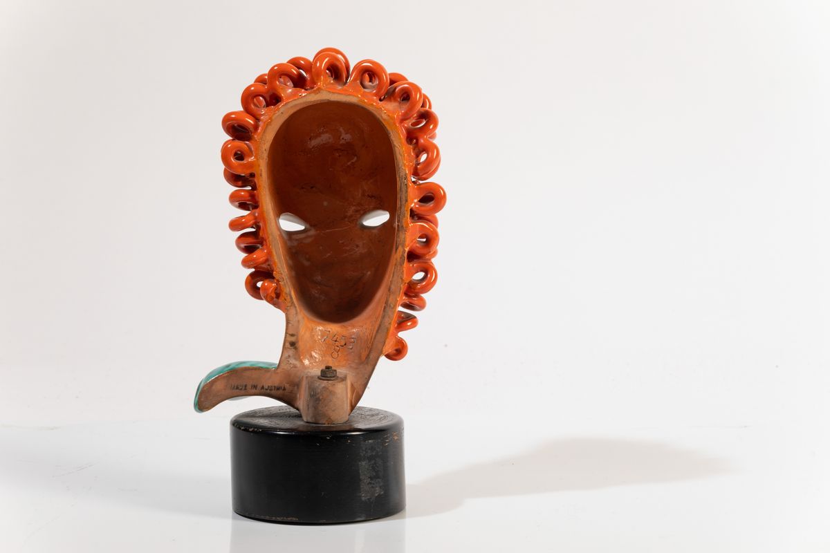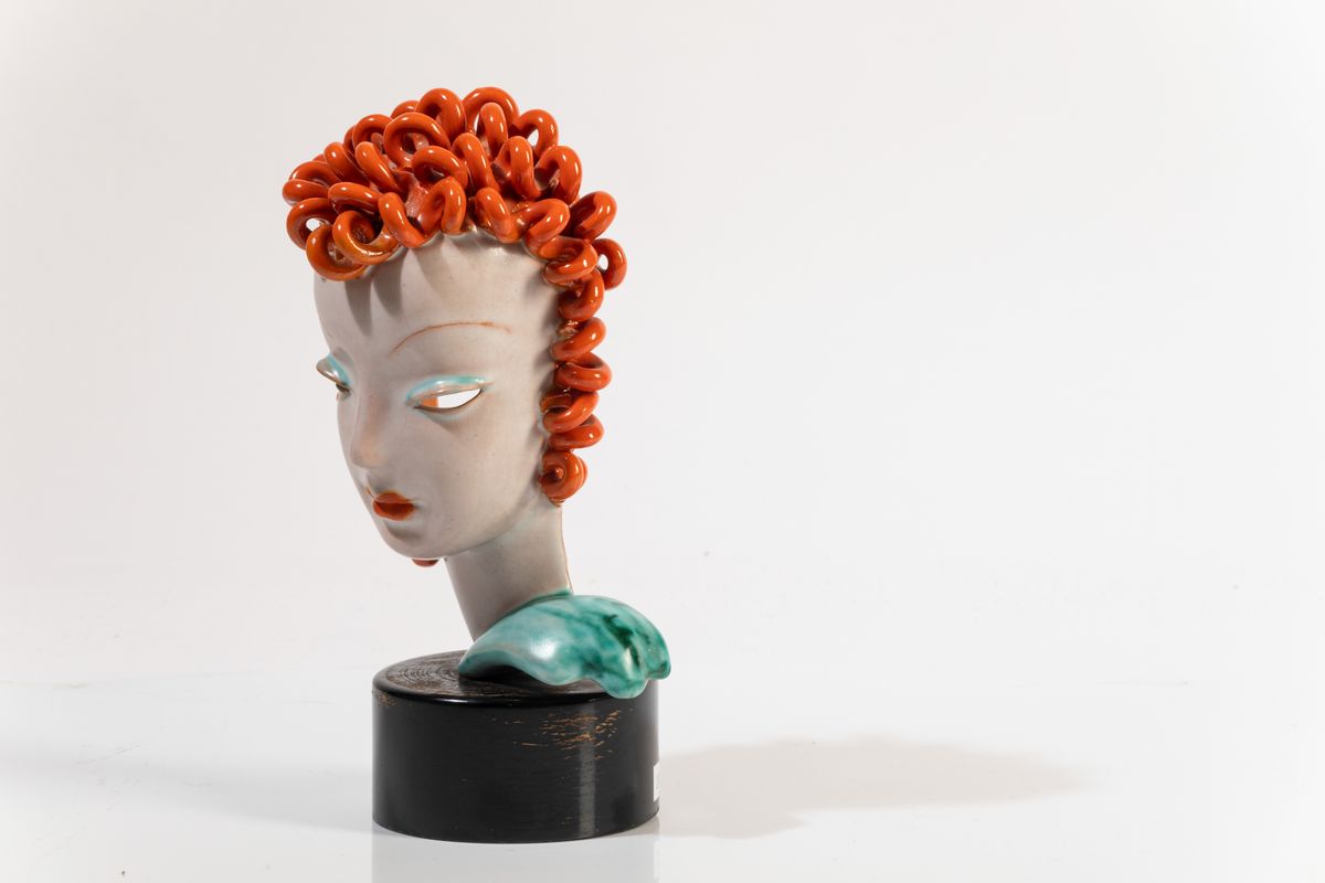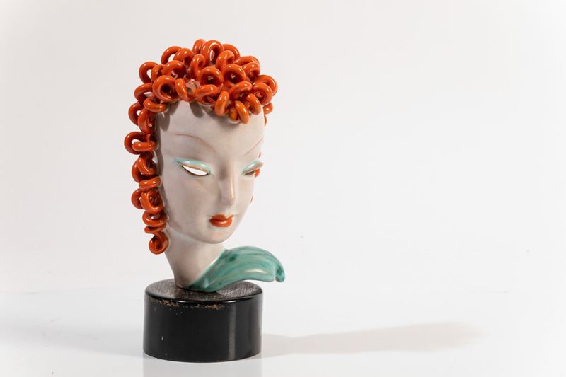 Testa femminile in ceramica con decoro a smalti su basamento in legno.