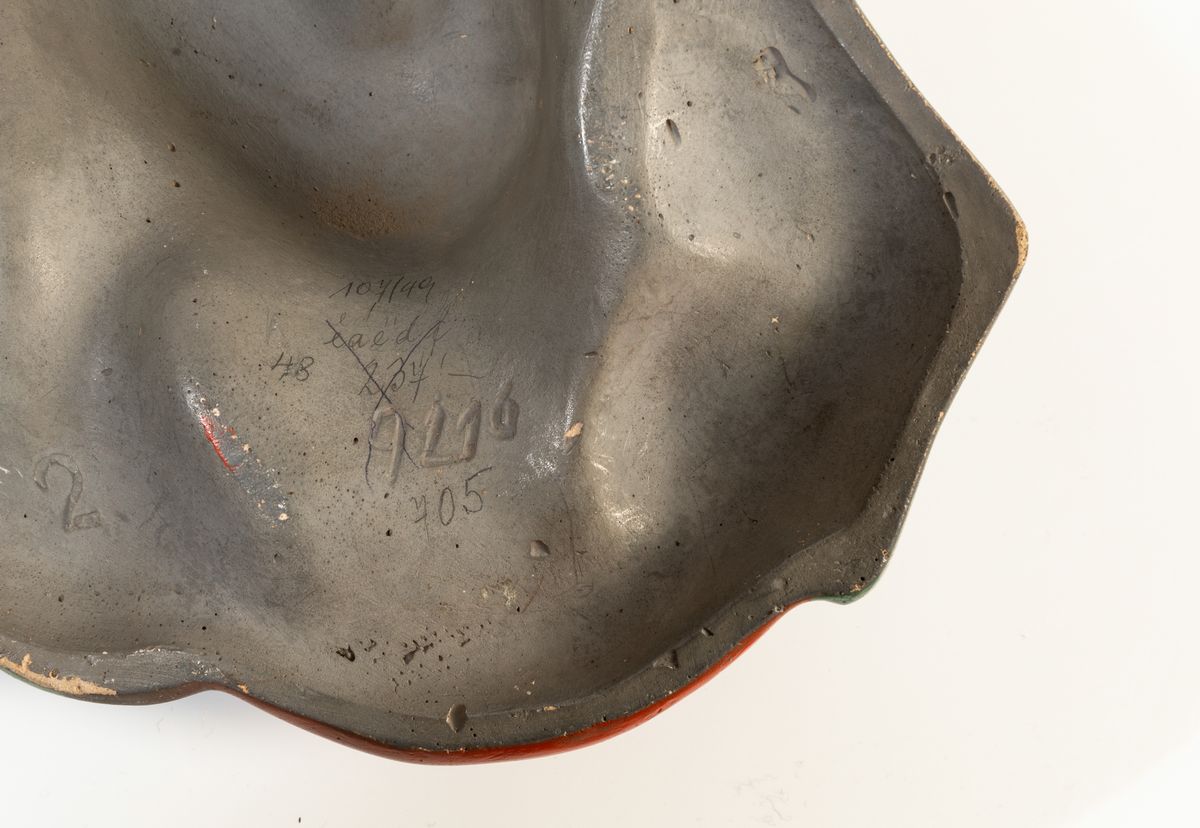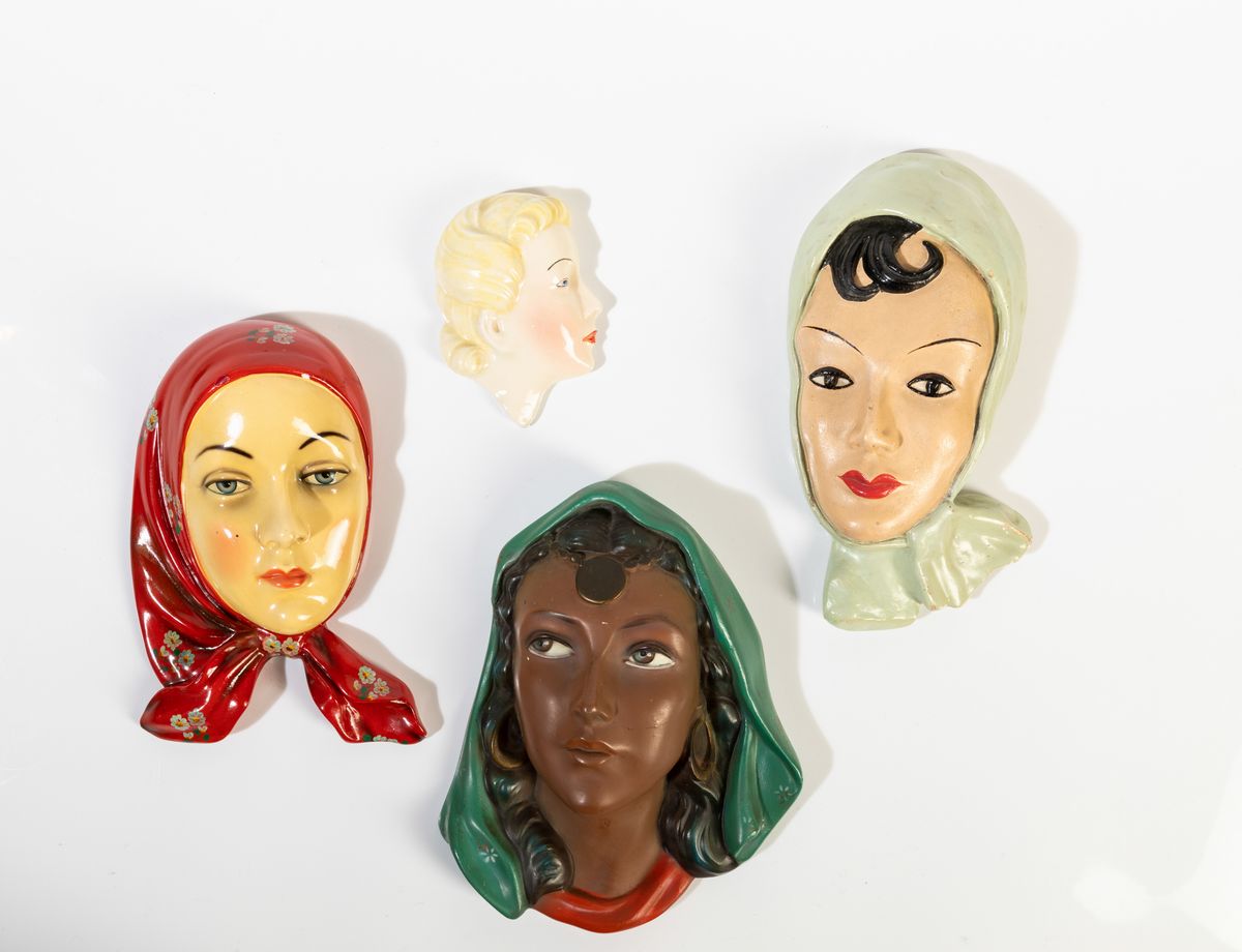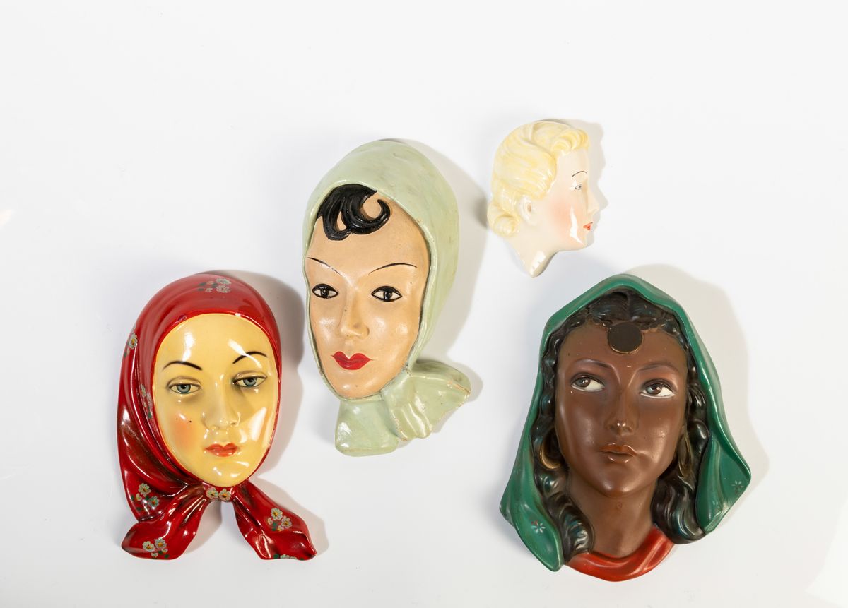 Quattro profili di donna in ceramica e gesso con decoro policromo.
