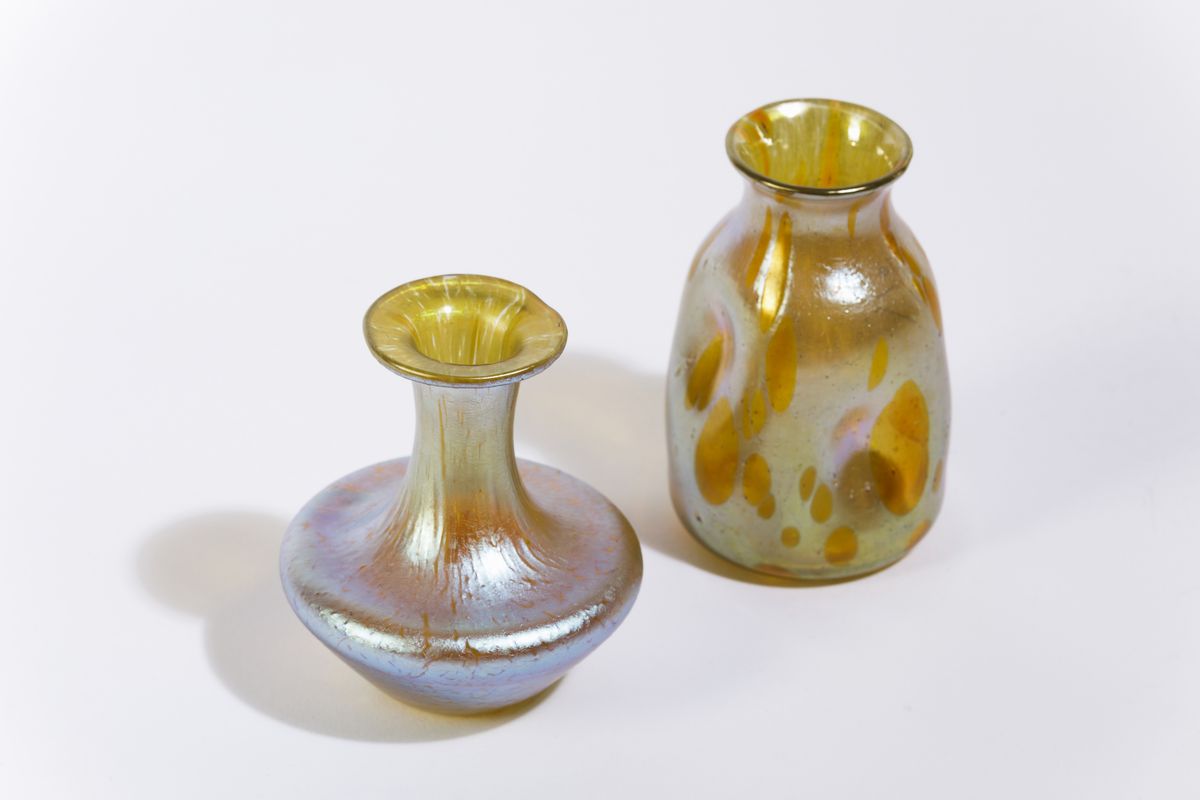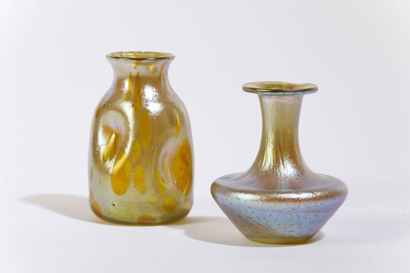 Due vasi in vetro soffiato con decoro a lustri iridescenti.
