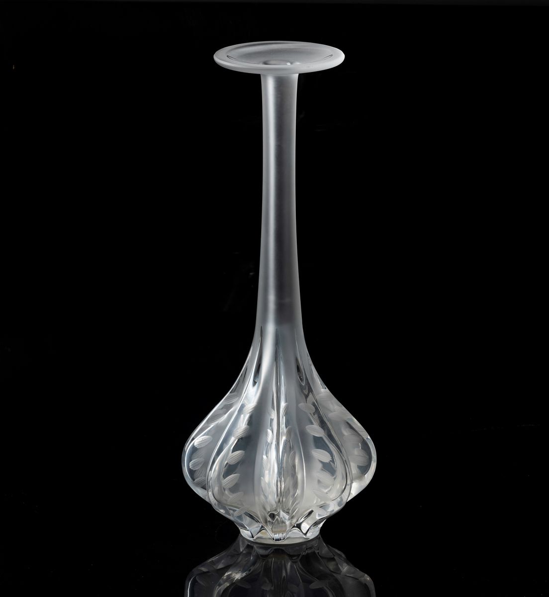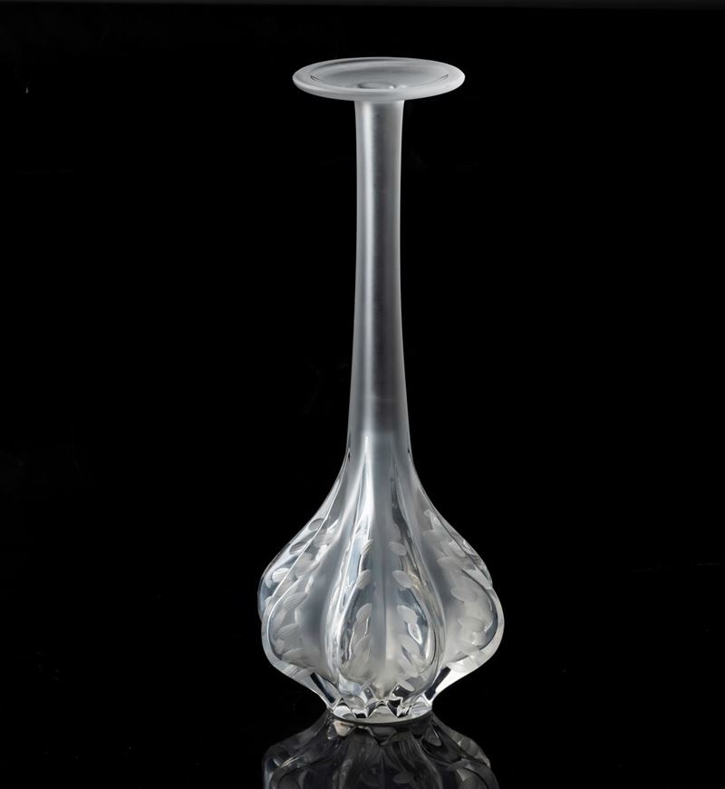 Vaso a bulbo costolato con alto collo modello Marie Claude in cristallo soffiato a stampo con decoro floreale stilizzato. Superficie interamente sabbiata.