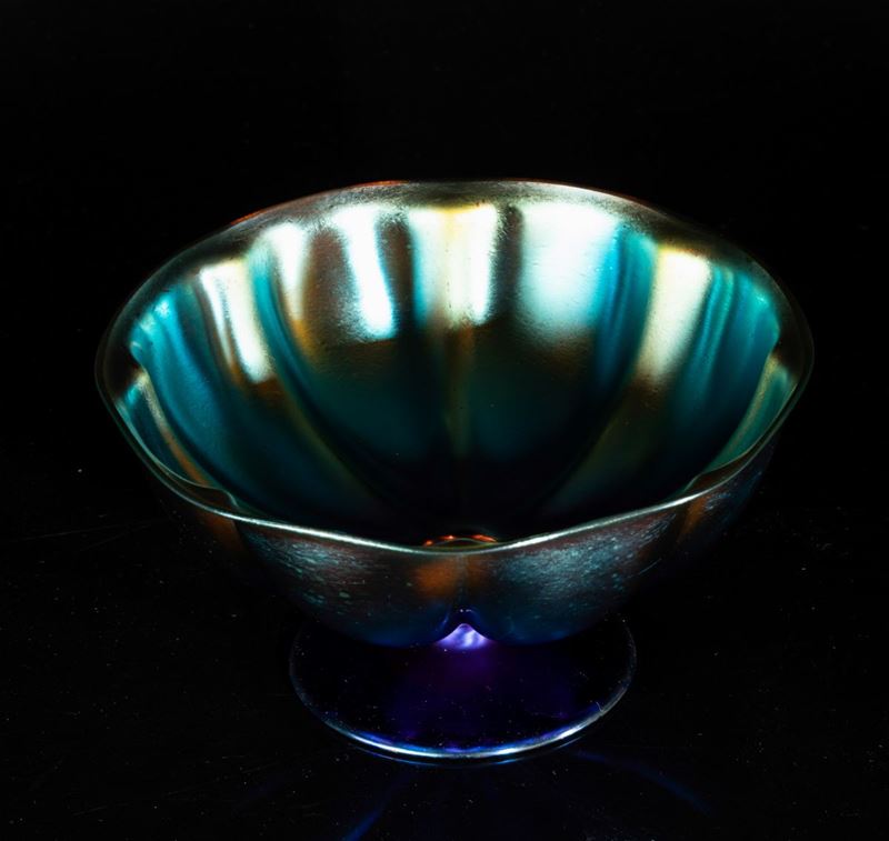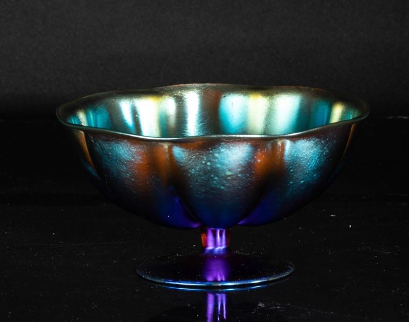Coppa in vetro soffiato in stampo a grandi baccellature, superficie interamente iridata.