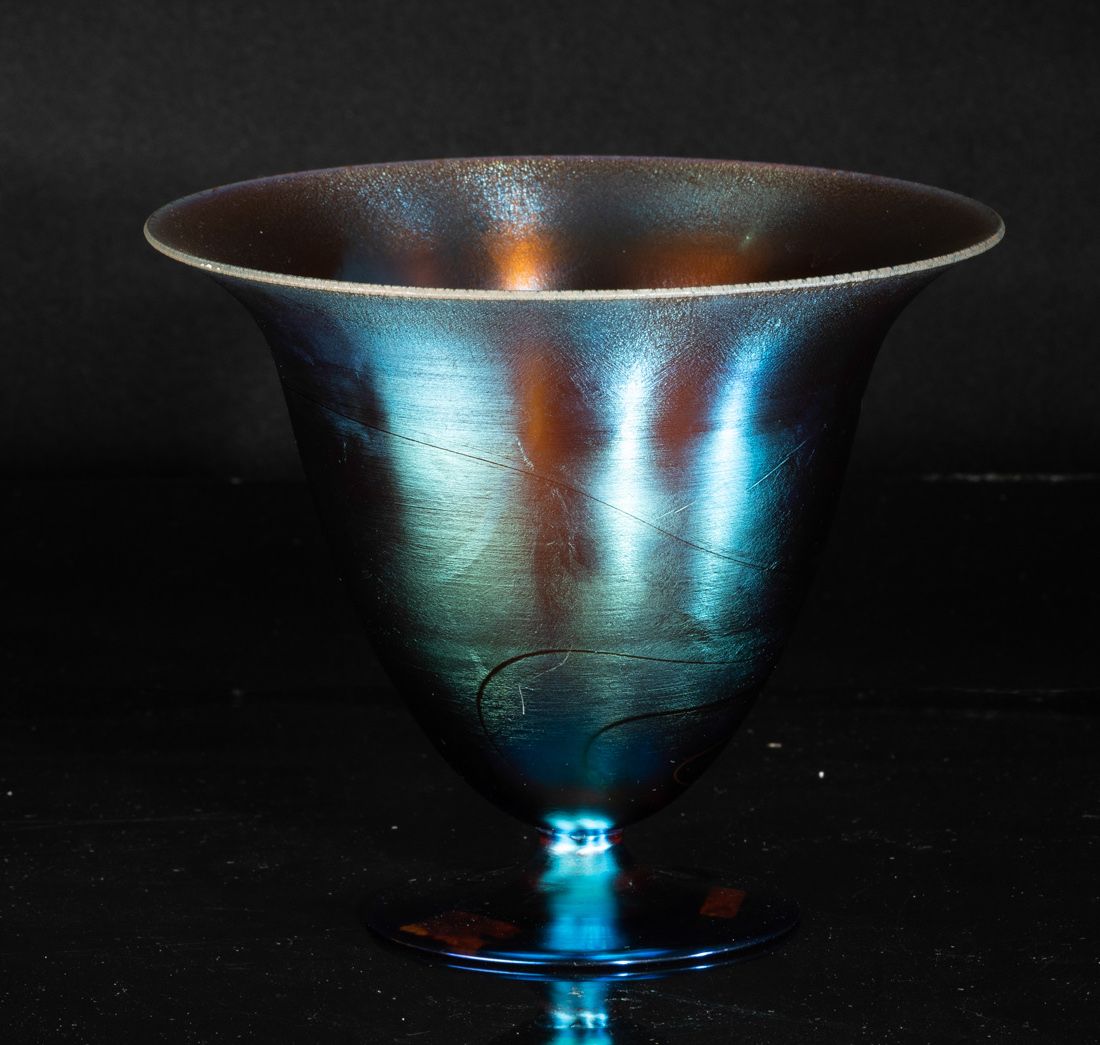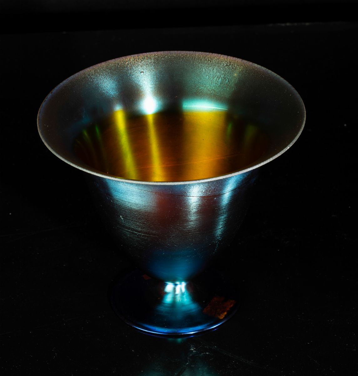 Coppa troncoconica in vetro soffiato con superficie interamente iridata.