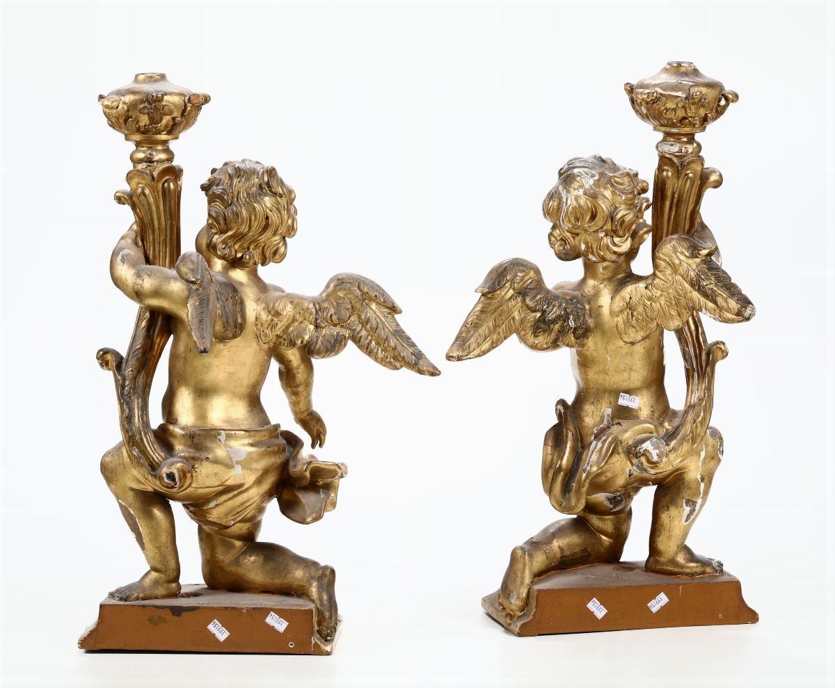 Coppia di putti reggitorcia in legno intagliato e dorato, XVIII secolo