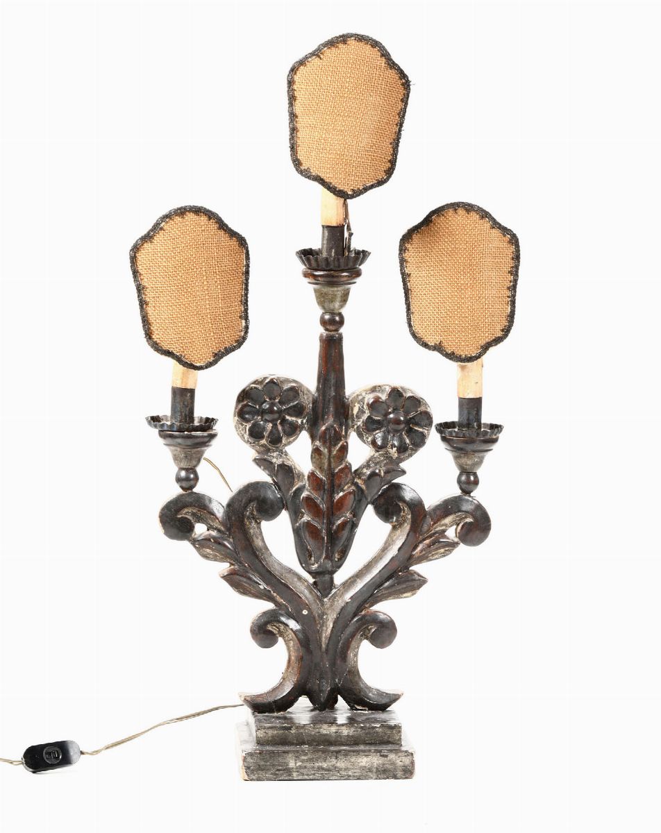Lume a tre fiamme in legno intagliato, XVIII secolo