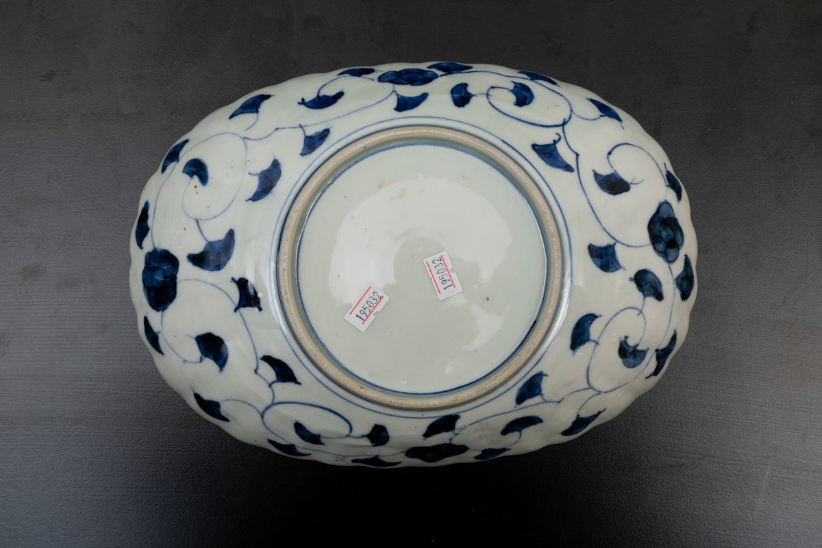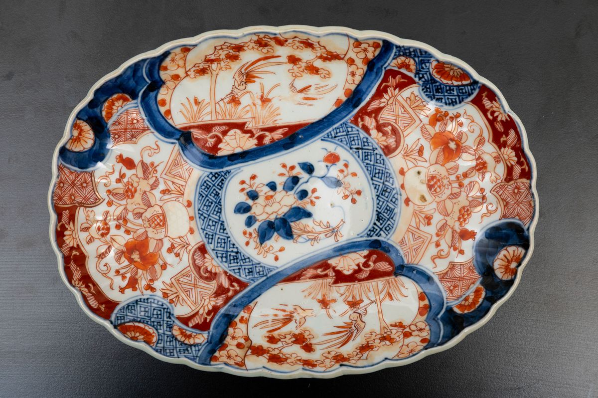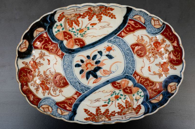 Coppia di piatti ovali in porcellana Imari con decoro floreale e soggetti naturalistici entro riserve, Giappone, periodo [..]