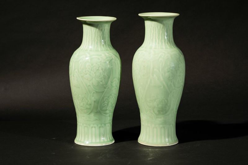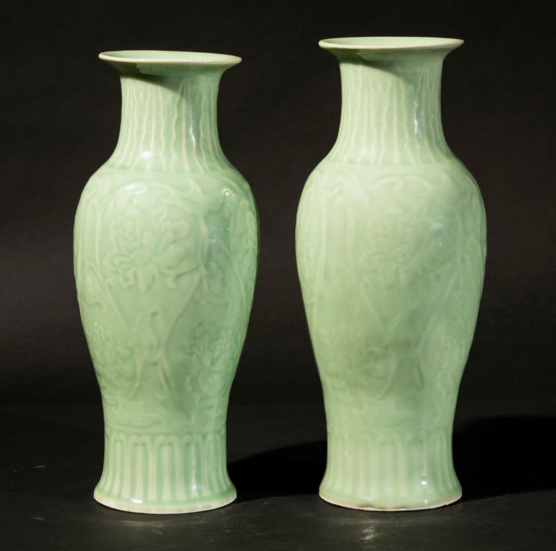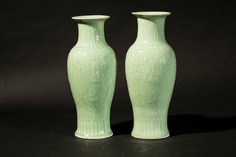 Coppia di vasi in porcellana celadon con decoro floreale, Cina, XX secolo
