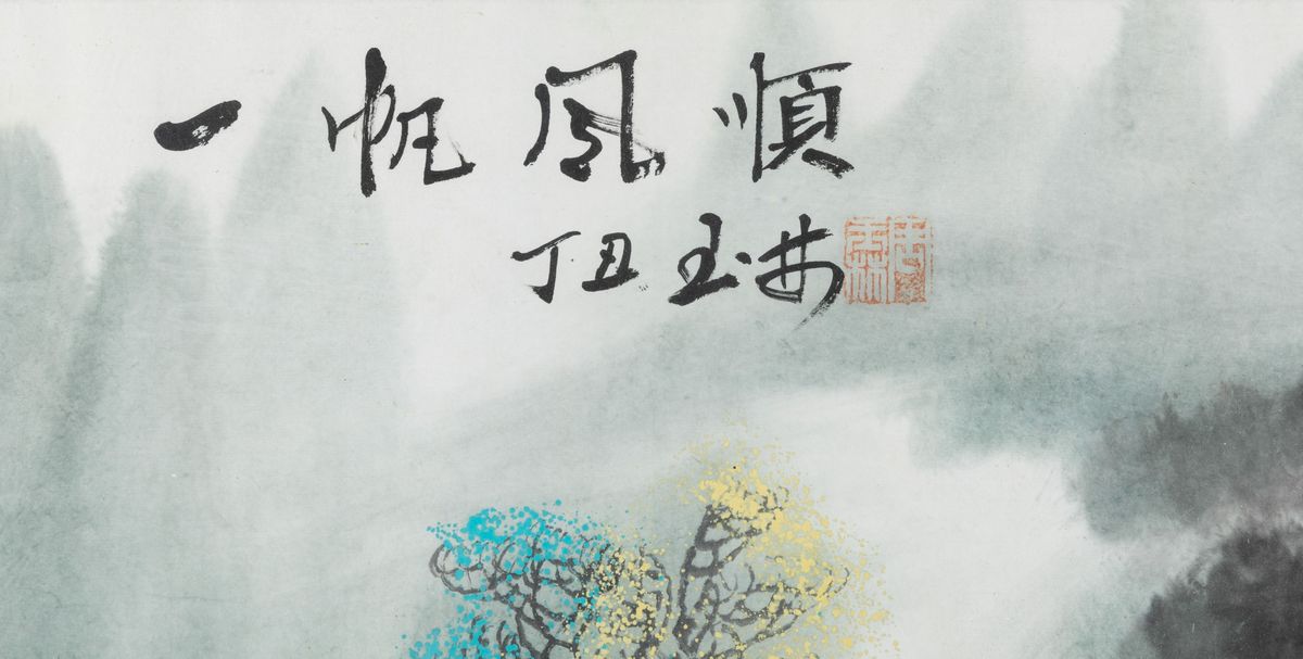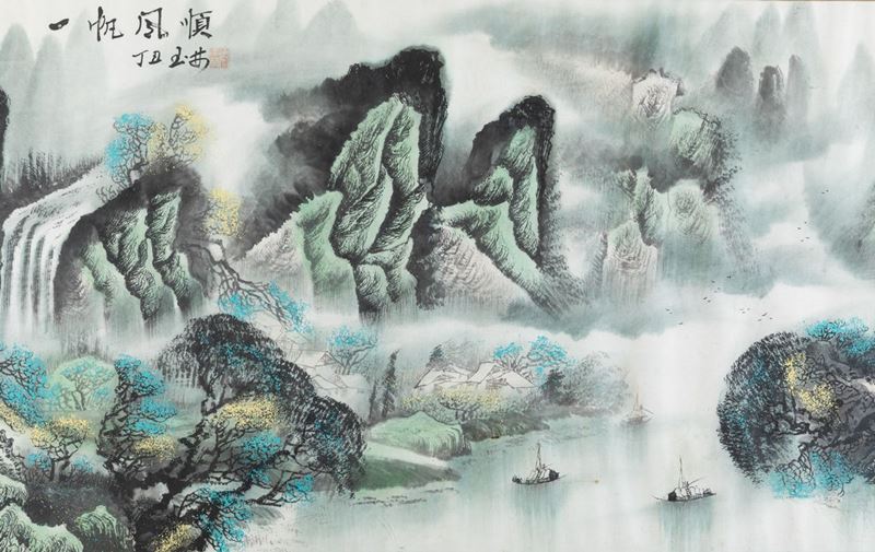 Dipinto su carta raffigurante paesaggio fluviale con imbarcazioni e iscrizione, Cina, XX secolo
