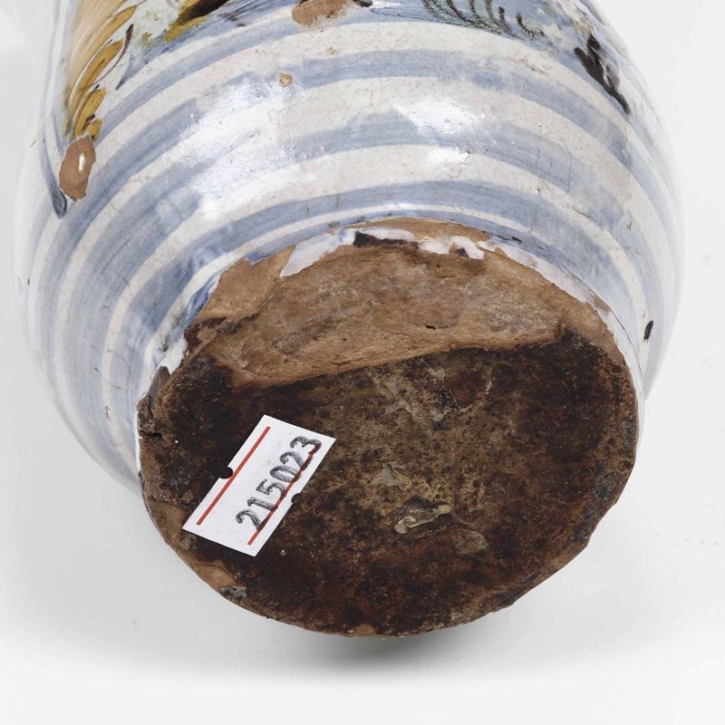 Maiolica. Dimensioni: altezza cm 19. Conservazione: rottura incollata al bordo superiore, sbeccature alla base