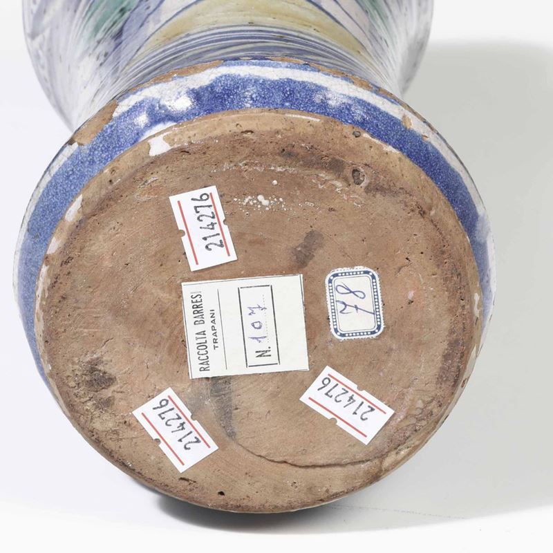 Maiolica. Altezza cm 27,5 circa. Conservazione: ottima; leggere sbeccature ai bordi