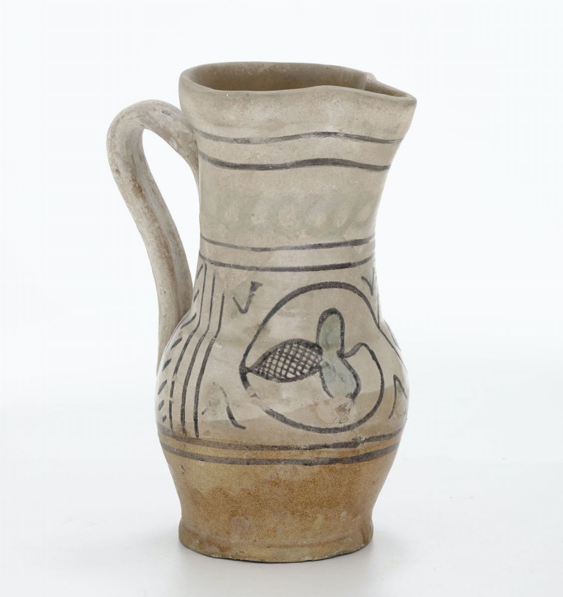 Boccale in maiolica arcaica, dal corpo globulare con alto collo svasato, labbro a nastro angolato e ansa a bastoncello, parzialmente rivestito di smalto stannifero e decorato con due fiori trilobati dal disegno in bruno di manganese e campiture in verde ramina. Un motivo a collana decora il collo