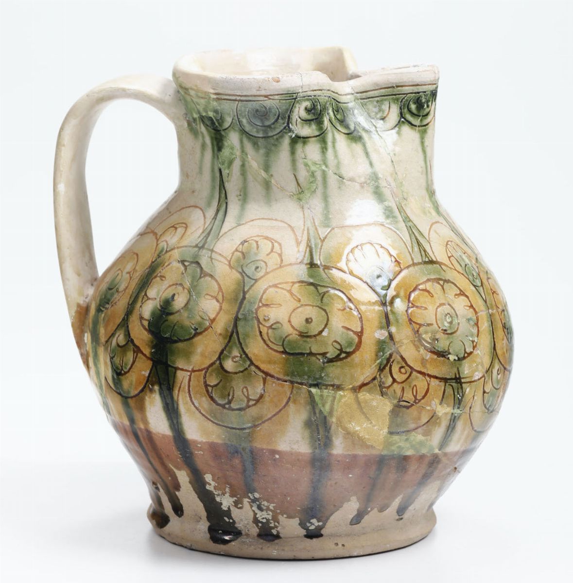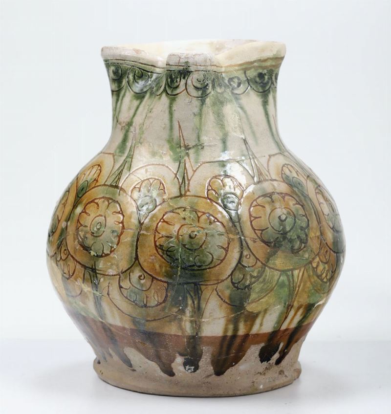 Grande brocca su piede a disco, dal corpo rigonfio sferoidale, con bocca trilobata e ansa a nastro, rivestita di ingobbio, graffito con un motivo decorativo basato su una catena di cerchi fioriti, e colorati con colature di verde ramina e bruno di manganese