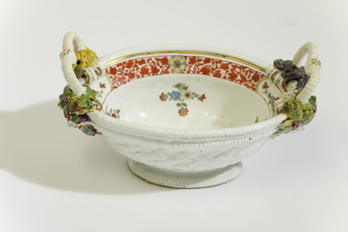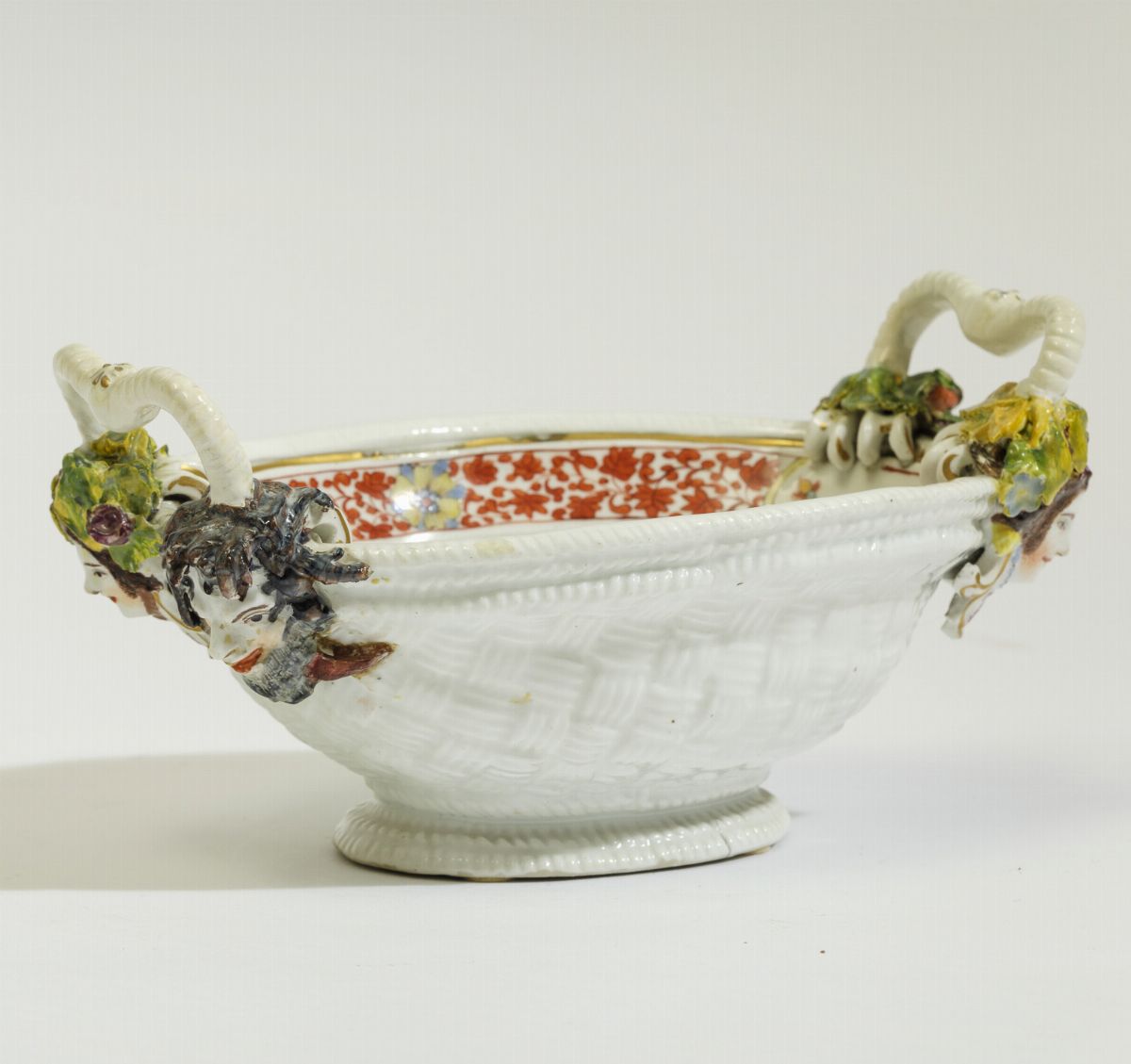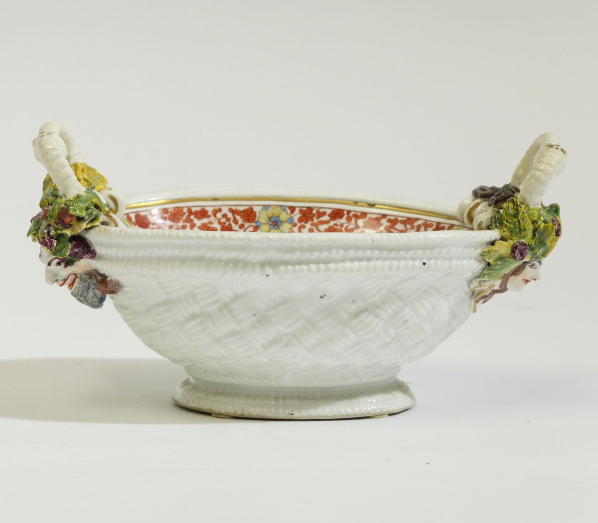 Il cestino, dalla forma ovale, presenta due manici che fuoriescono da quattro mascheroni raffiguranti le stagioni ed ha la superficie esterna modellata a rilievo ad imitazione del vimini. La decorazione pittorica policroma all’interno del contenitore presenta sul fondo un uccello orientale e sulle pareti quattro ramoscelli di “Indianische Blumen” ossia fiori orientali. Al bordo nastro d’ispirazione Arita