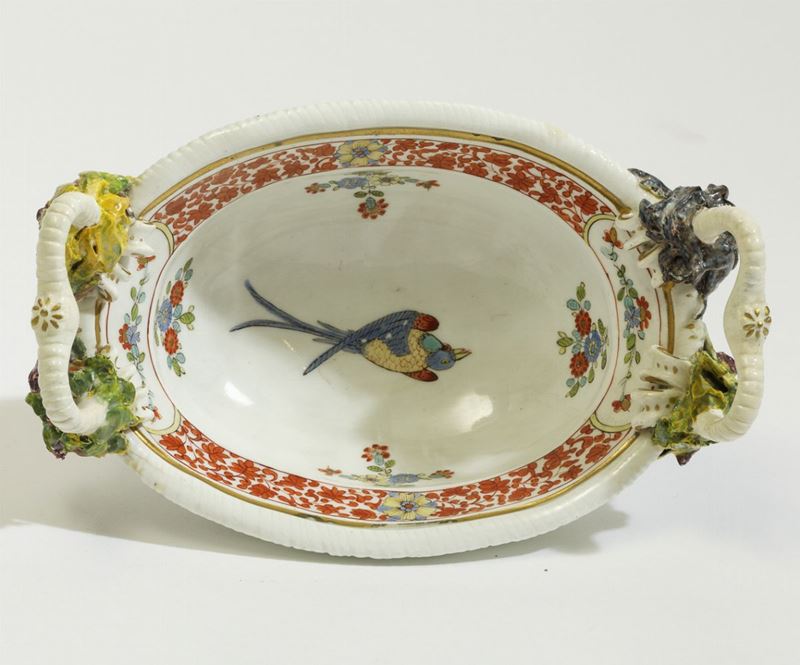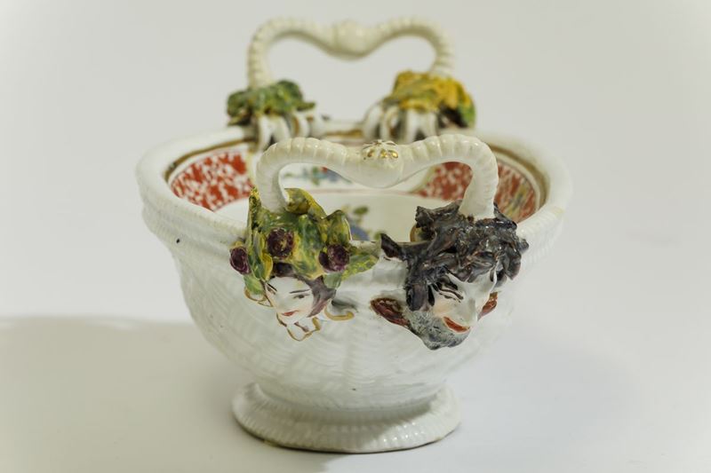 Porcellana. Marca: spade in blu. Dimensioni: altezza cm 9,5; 18,2 x 11,5. Manici rifatti; estesi restauri alla vegetazione ai mascheroni e ad una barba