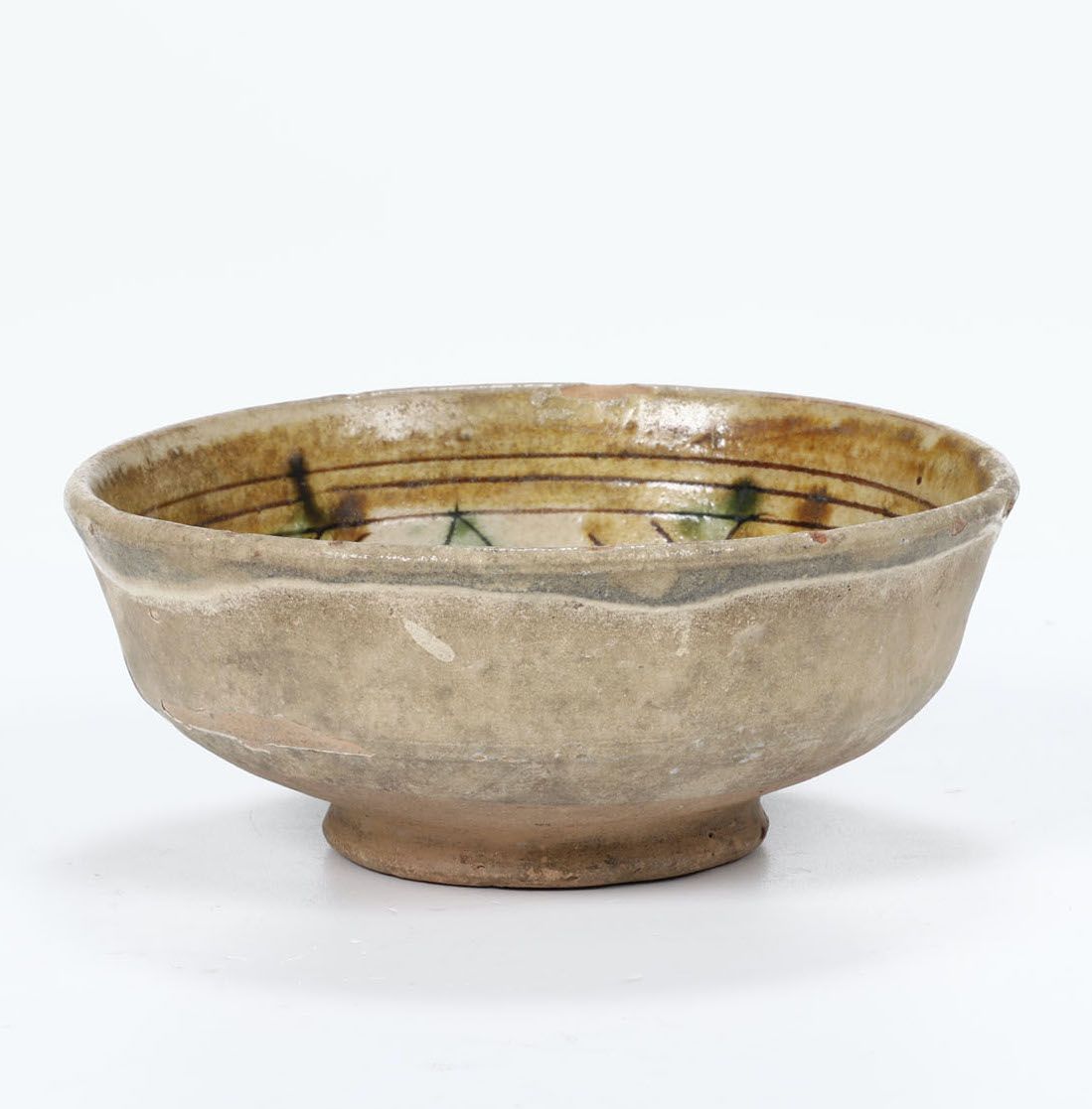 Ciotola su basso piede, leggermente carenata, dal labbro leggermente rigonfio, ingobbiata, e invetriata all’interno. La decorazione graffita vede un rapido disegno floreale, a struttura radiale, colorato da tocchi in verde ramina e giallo antimonio