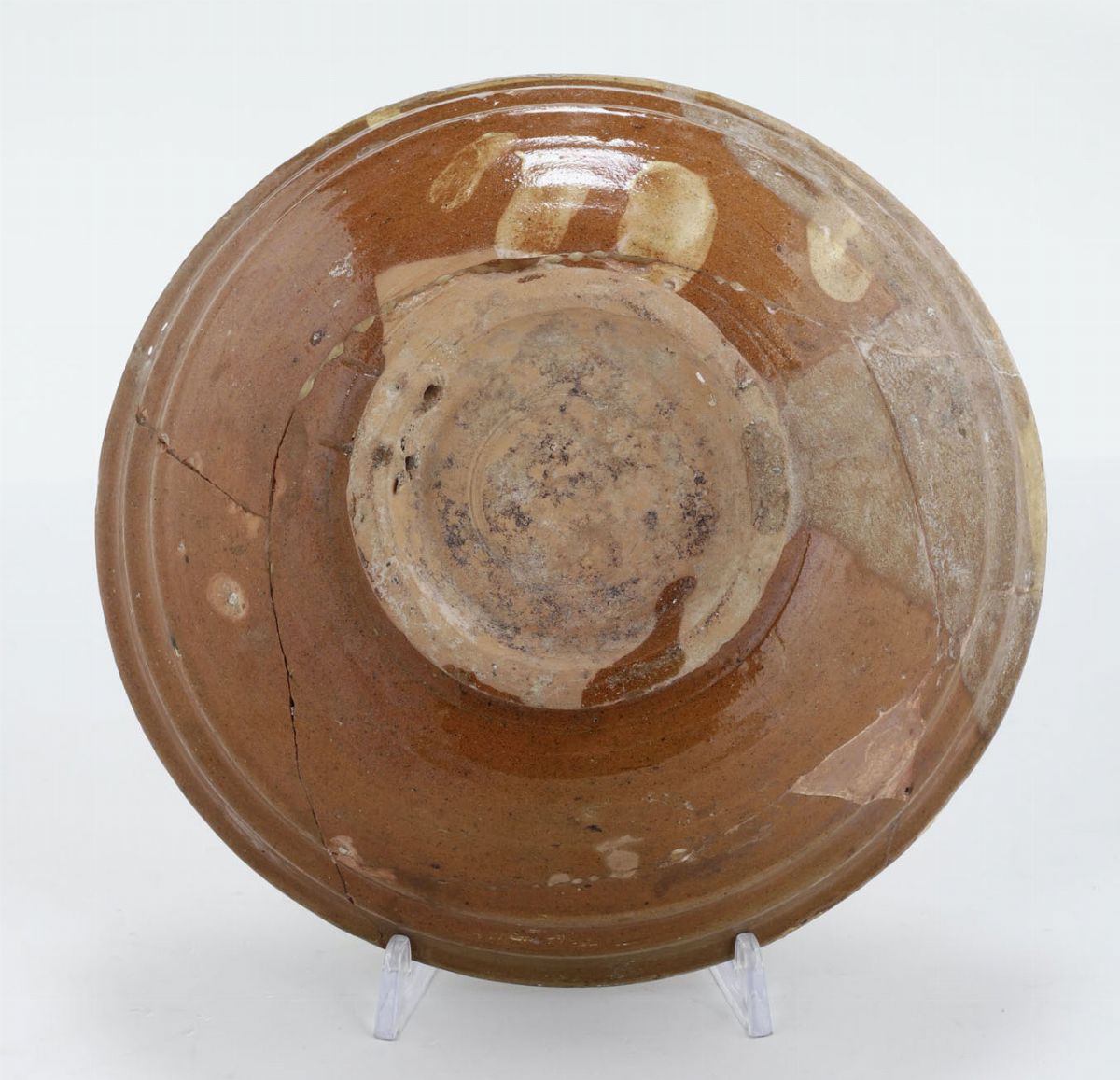 Terracotta ingobbiata e invetriata. Altezza cm 7,5; diametro cm 20,5. Conservazione: rotta in diversi frammenti e ricomposta; piccola integrazione