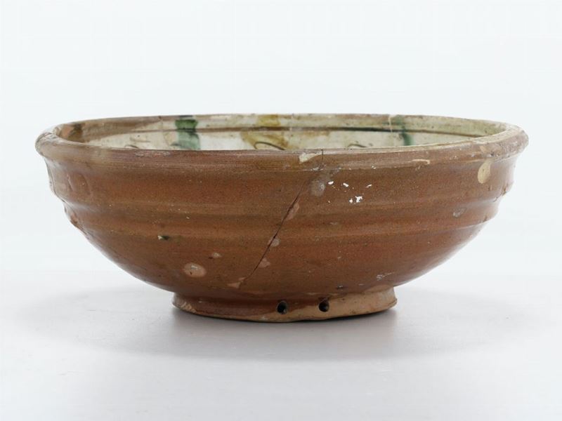 Ciotola ingobbiata con decorazione graffita quadripetala e con pennellate ocra e verde ramina. Una ciotola molto simile è pubblicata da A.Amidei, in Antiche Ceramiche Senesi (Siena 2014, p. 26) come somigliante alla produzione della fornace senese dell’Abbadia Nuova