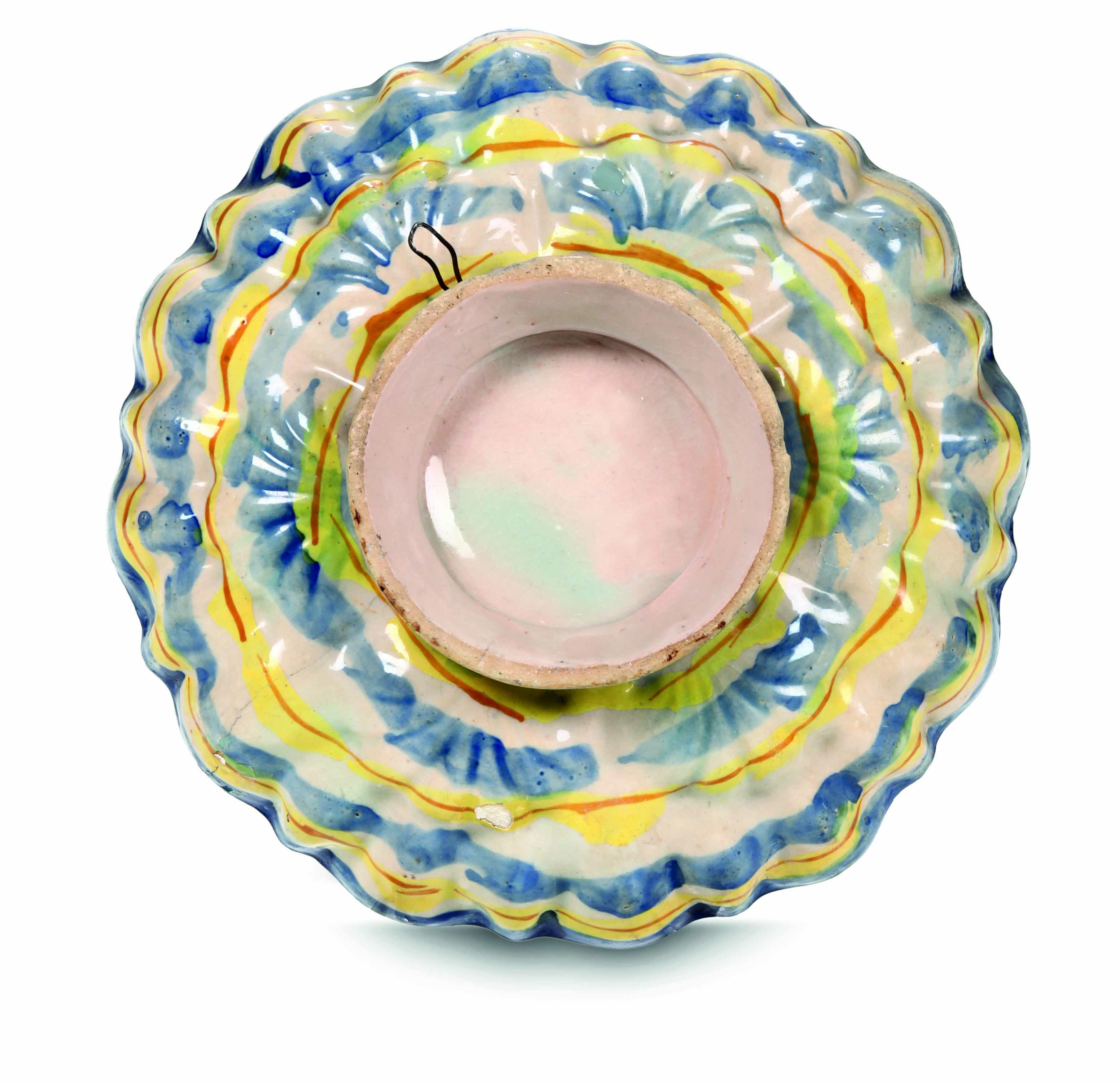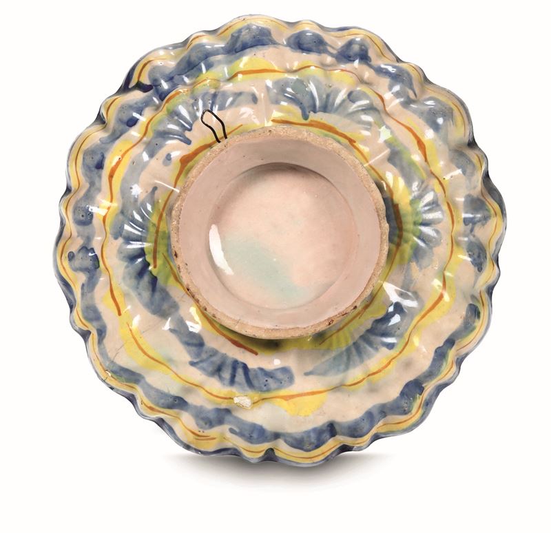 Maiolica policroma. Altezza cm 7 circa; diametro cm 24. Conservazione: insignificanti felature e cadute di smalto di cui una ripresa in restauro al bordo