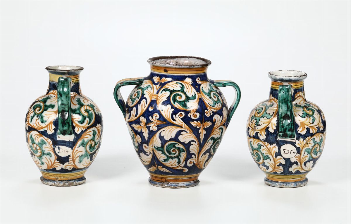 Maiolica. Altezze cm 23,5; 24,5; 26. Conservazione: qualche minima sbeccatura; una brocca con parte del collo integrato; l’altra brocca e il vaso con felature accompagnate da minime integrazioni pittoriche
