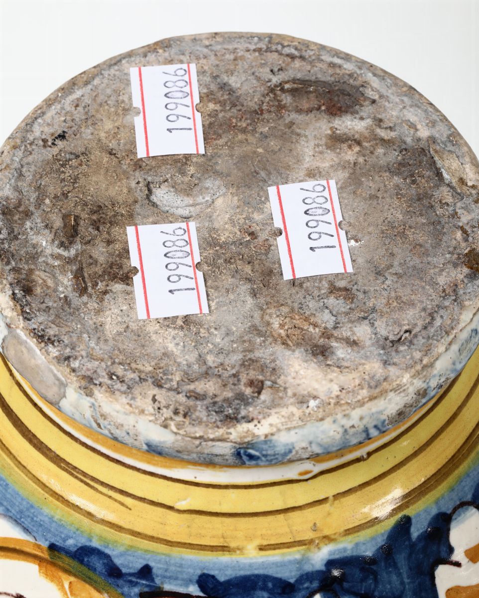 Vale commentare insieme queste tre opere a destinazione farmaceutica in ragione della veste decorativa che le accomuna. Si tratta di due brocche (“utelli”), di forma ovoidale, alto colletto svasato con orlo leggermente estroflesso, versatore cilindrico a tubetto e manico a nastro. Al centro è un vaso a corpo ovoidale, ampia bocca a basso colletto svasato e prese laterali a nastro (Figg. a, b); esso conferma la sua destinazione anche per la presenzaa del cartiglio su sui è la scritta abbreviata “FAN.A DI CECI” (farina di ceci). Su tutti e tre gli esemplari la decorazione si basa su una trama di girali con foglie, avvolte su se stesse e a bordo frastagliato, simili all’acanto. All’attacco inferiore del manico delle due brocche, entro medaglioni “a risparmio, è tracciata la sigla “DG” (Fig. c).