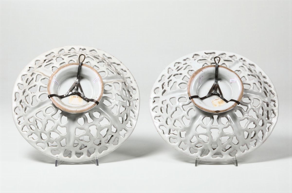 Questa coppia è una delle più raffinate espressioni dei “bianchi”, la cui destinazione poteva essere di portafrutta o di “panatier”, cioè portapane, secondo la denominazione che si ricava dagli inventari della bottega faentina dei Bettisi, rispettivamente del 1568 e del 1590. La cronologia, in mancanza di opere datate, in alcuni casi stemmati si può ricavare attraverso gli anni del personaggio celebrato nell’araldica, come una coppa per il cardinale Federigo Corner (1579- 1653), dipinto al centro di una coppia di coppe traforate, del Museo di Faenza, che conserva anche una terza coppa, con stemma prelatizio Niccolini, tutte della stessa foggia di questa in esame (NOTA… RAVANELLI GUIDOTTI 1996, scheda 114, pp. 438 e s.). Inoltre a Faenza, di tale tipologia traforata, potevano essere proposte delle varianti, sia nella forma sia nello smalto. Sono infatti attestate coppe traforate ovali, ottagonali, poligonali o con profilo “a stella”, realizzate per lo più nel canonico smalto, latteo e corposo, dei “bianchi”, ma talora anche in smalto azzurro “berettino” (NOTA…. RAVANELLI GUIDOTTI 1998, scheda 142, pp, 517 e s.).