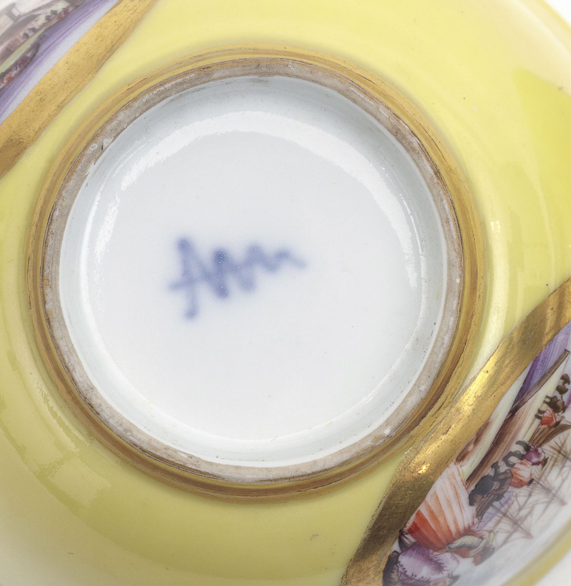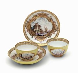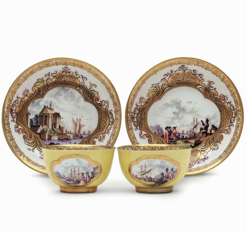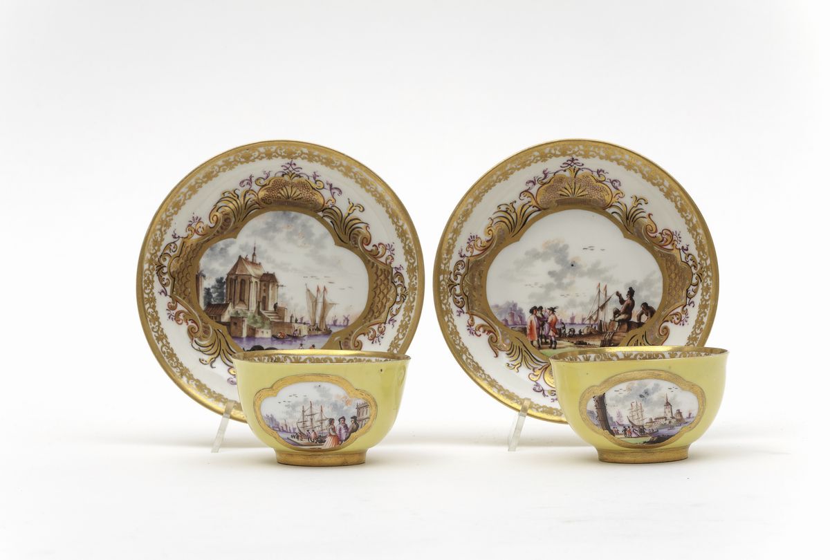 Sia l’esterno delle tazze che dei piattini sono a fondo color giallo. La decorazione policroma vede riserve con scene di porto poste in riserve quadrilobate sulle tazze e incorniciate dal “Laub- und Bandelwerk” (ossia “a foglie e nastri”) sui piattini. All'interno delle tazze ramoscelli di fiori indiani; ai bordi interni profilatura a nastro con elementi vegetali stilizzati in oro