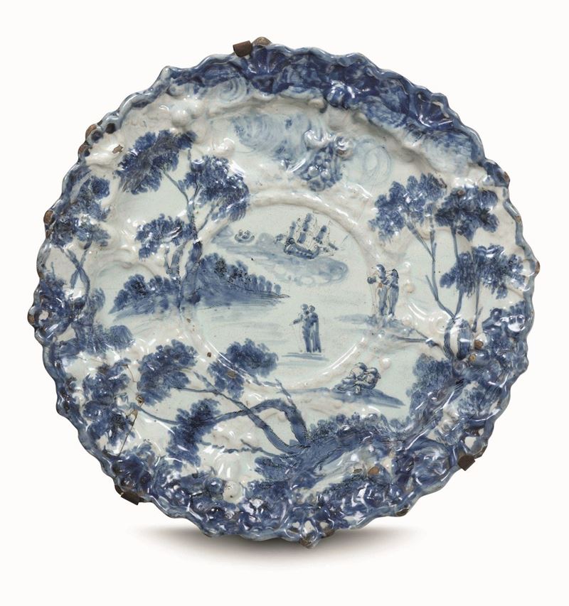 Il piatto realizzato a stampo è detto piatto reale. La decorazione, in monocromia blu di cobalto su smalto leggermente azzurrato, vede un ampio paesaggio con grandi alberi e “figuretti” e un veliero sullo sfondo. Sul verso tralci vegetali stilizzati