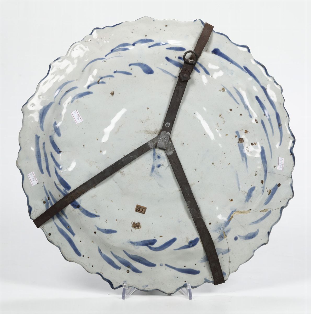 Maiolica. Marca: fortezza in blu. Diametro cm 46. Una rottura ricomposta in restauro, felature, minime sbeccature