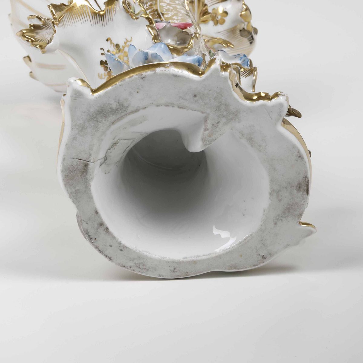 Porcellana. Marca: assente; lettere “V” e “F” incise. Altezza cm 45. Conservazione: buona; qualche sbeccatura e restauro ai fiori.