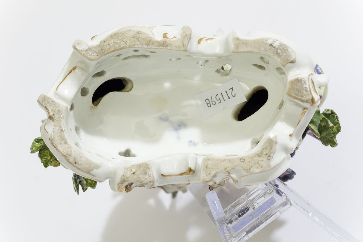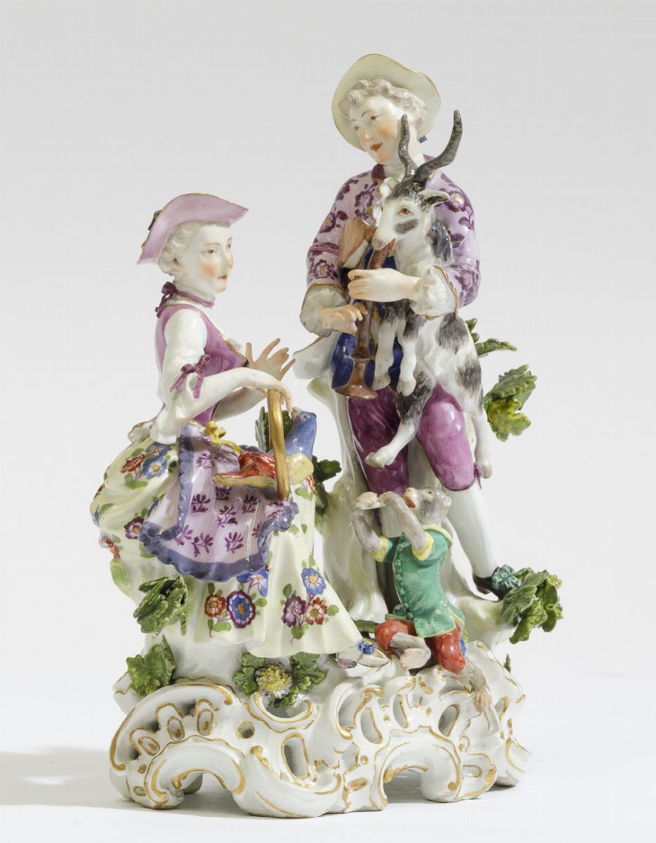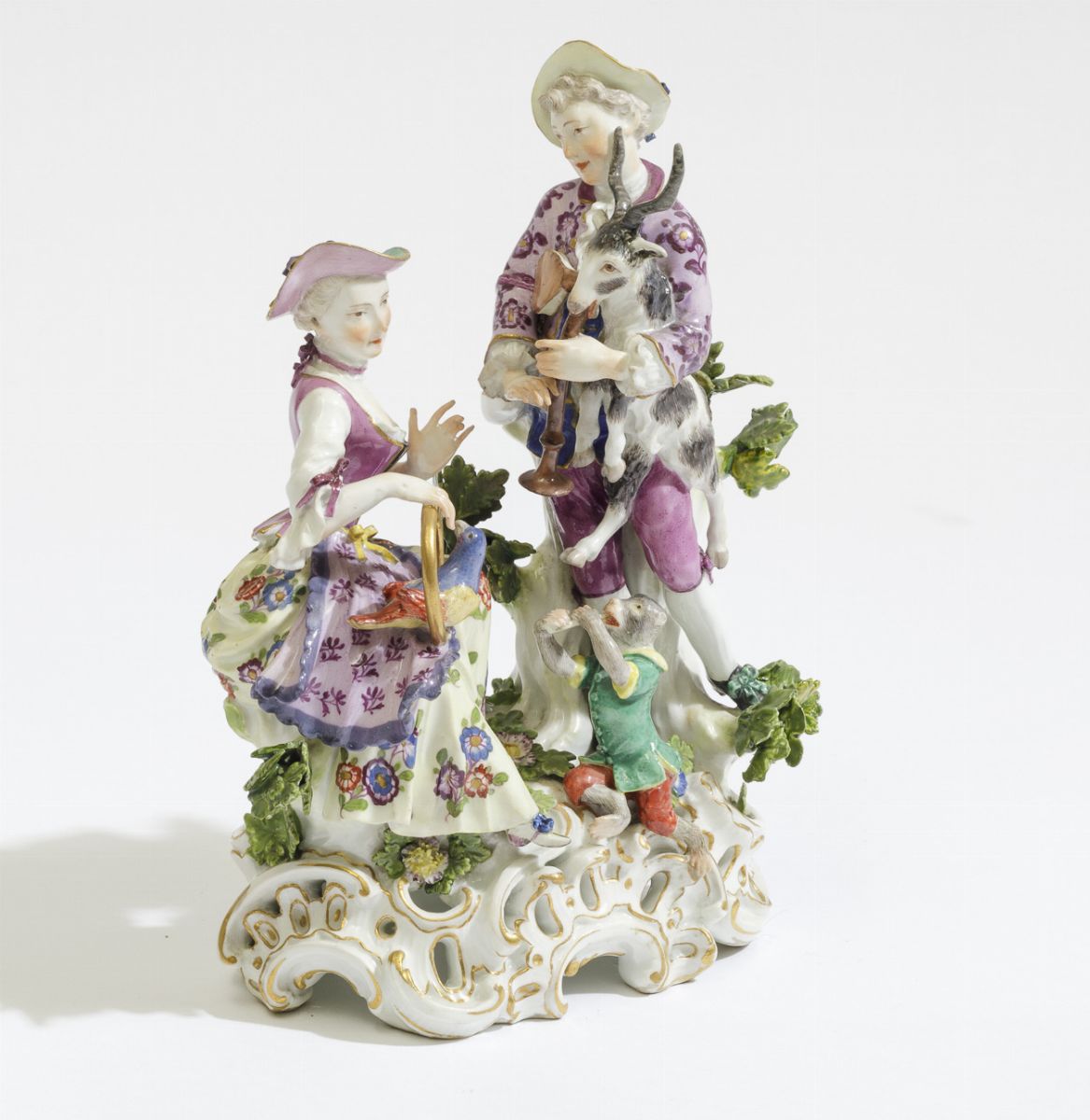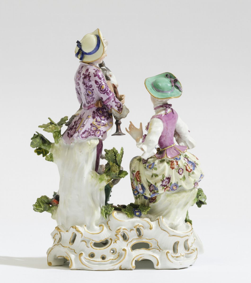 Una coppia elegantemente vestita poggia su un’alta base a rocailles forate e lumeggiate in oro. Tra di loro una scimmietta seduta sulle rocailles suona un piffero. Il giovane, appoggiato ad un tronco, è in piedi con in grembo una capra e assieme sono intenti a suonare un piffero, mentre la giovane seduta ascolta e tiene con la mano destra un cerchio dorato con un pappagallo
