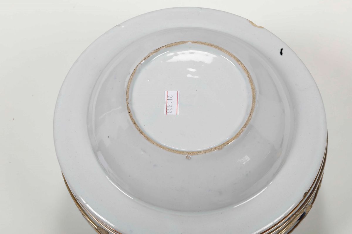 I piatti fondi, dal bordo liscio listato in oro, sono decorati con il motivo “alla pagoda” o “al casotto”, più comunemente conosciuto come quello “al carabiniere”, in tricromia Imari con blu, rosso e dorature