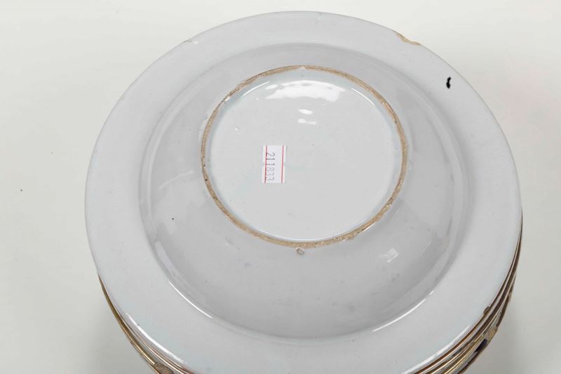 Maiolica. Marca: assente. Diametro cm 23,2. Conservazione: buona; alcune sbeccature al bordo