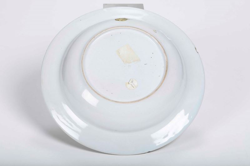 Maiolica decorata in tricromia a piccolo fuoco. Marca: assente. Diametro cm 22,7. Conservazione: minime sbeccature al bordo.