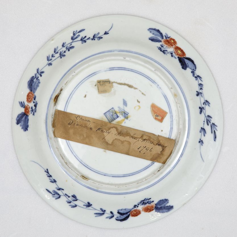 Il piatto è decorato in monocromia blu a gran fuoco sotto smalto con zolle e rocce forate da cui spunta vegetazione diversa. Il paesaggio è poi stato dipinto a cineserie con colori insolitamente molto tenui: rosso ferro, bruno, porpora, oltre al nero, al verde e al giallo in particolare per gli insetti e l’uccello in volo. Le grandi figure cinesi hanno inoltre pochi elementi in blu mentre la vegetazione è arricchita da fiori prevalentemente in rosso con pochi tocchi di giallo e verde