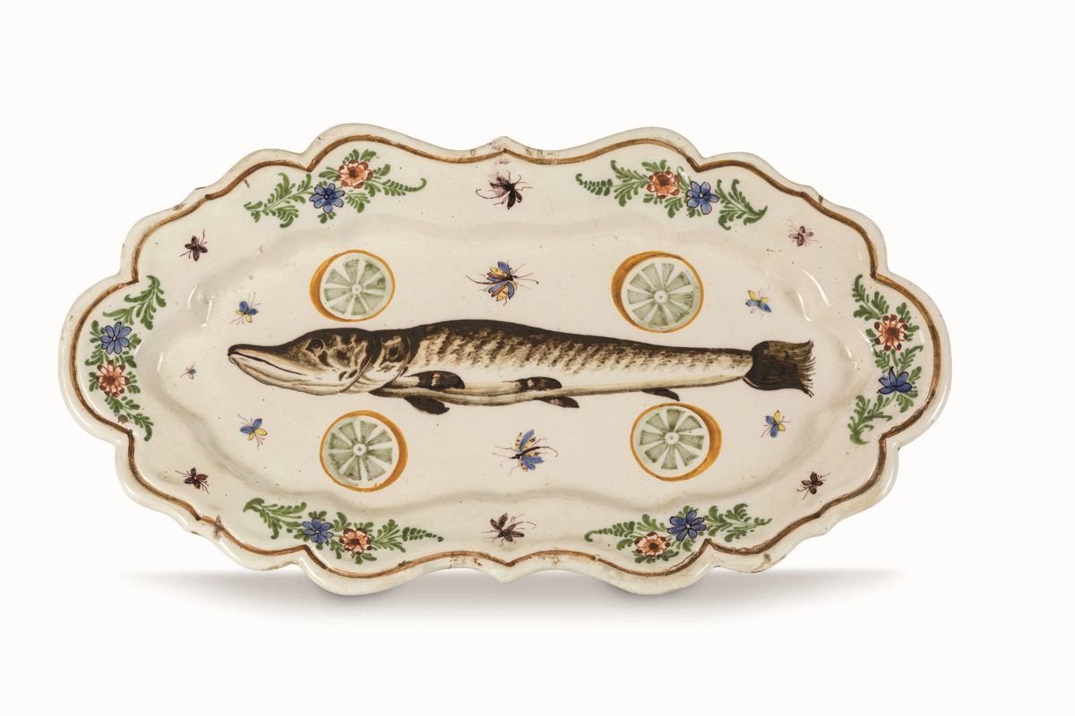 Piatto piano ovale dal profilo mistilineo col bordo sagomato a rilievo, rivestito di smalto stannifero e decorato con un luccio rappresentato in stile naturalistico a “trompe-l’oeil” tra quattro fette di limone e insetti diversi. La tesa, orlata in bruno, è decorata con tralci fioriti e piccoli insetti bruni