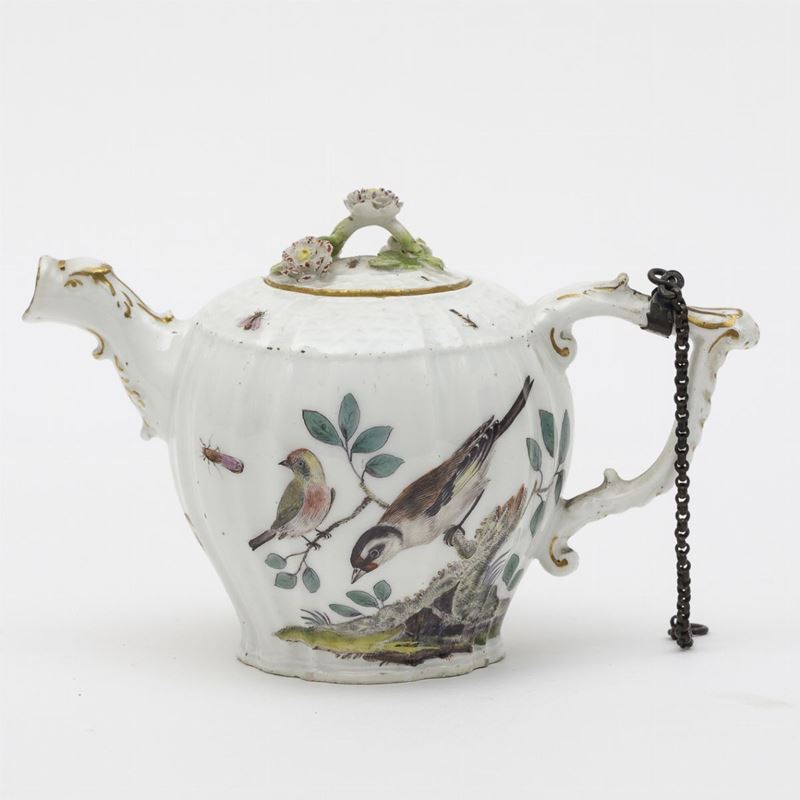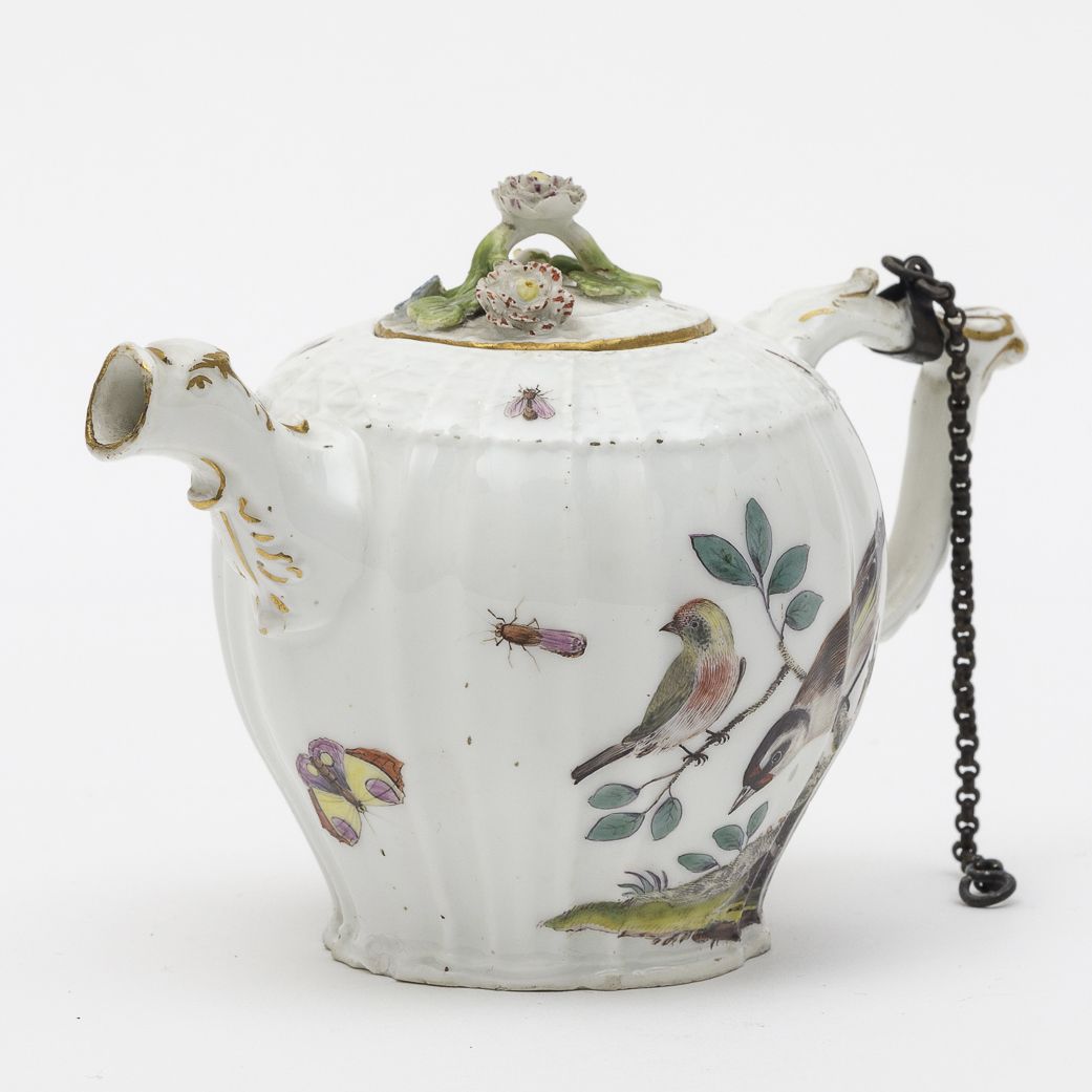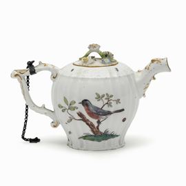 Il motivo “Altbrandenstein” a rilievo orna la superficie di questa teiera dalla forma globulare con manico a “J” e beccuccio a testa d’animale. Il coperchio, legato al manico da una catenella in metallo argentato, porta una presa formata da un ramoscello fiorito e fogliato. Sulle due facce troviamo la decorazione pittorica policroma ornitologica: da una zolla erbosa fuoriesce un tronco con rami su cui sono appollaiati gli uccelli. Il resto della superficie ospita insetti sparsi