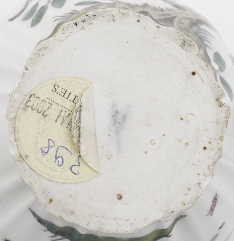 Porcellana. Marca: spade in blu. Altezza cm 9,2. Conservazione: buona; presa rincollata, mancanze minori alla vegetazione del coperchio; piccole sbeccature alla base; leggere usure all’oro