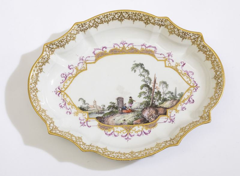 Il piccolo vassoio ovale dal bordo polilobato è listato e arricchito internamente da un elaborato motivo in oro. Al centro grande riserva, incorniciata dal motivo a volute detto “Laub-und Bandelwerk” in oro, rosso porpora e lustro, che ospita un paesaggio policromo sassone con riva animata