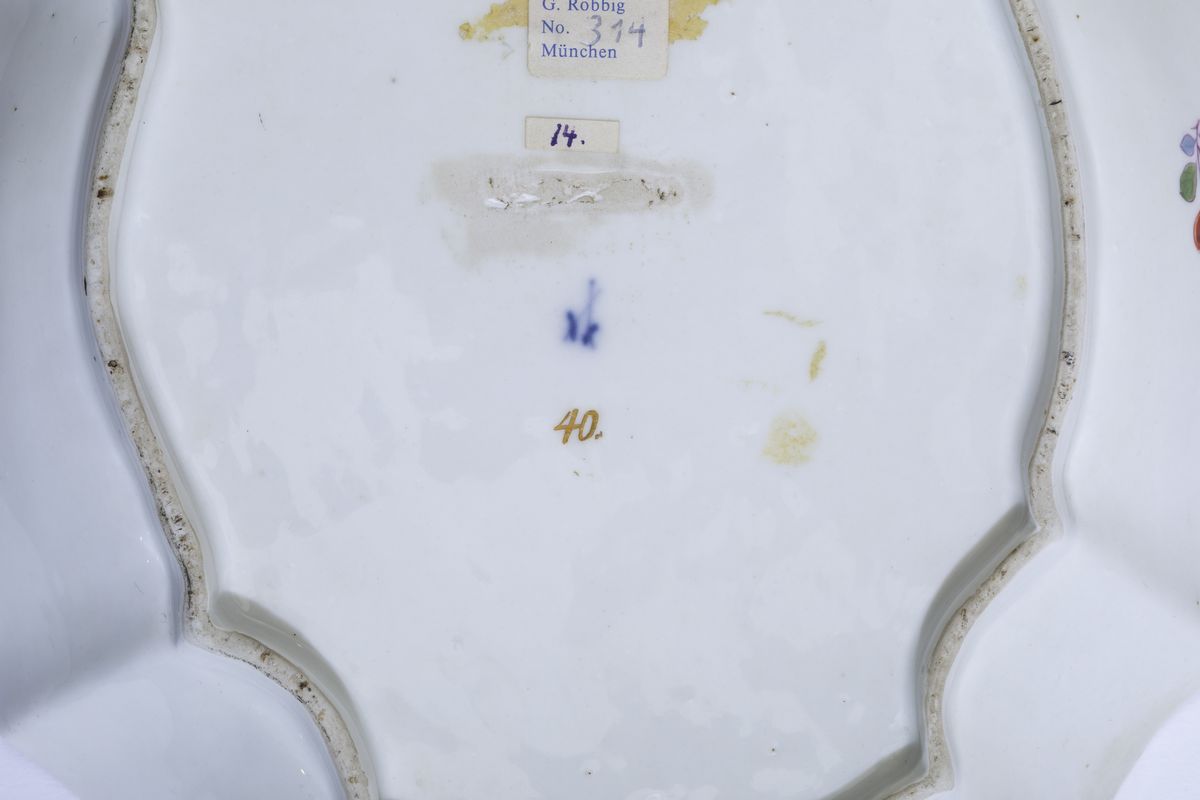 Porcellana. Marca: spade in blu; numero 40. in oro. Dimensioni: cm 24,4 x 19,5. Conservazione: ottima. Provenienza: G. Roebbig, Muenchen