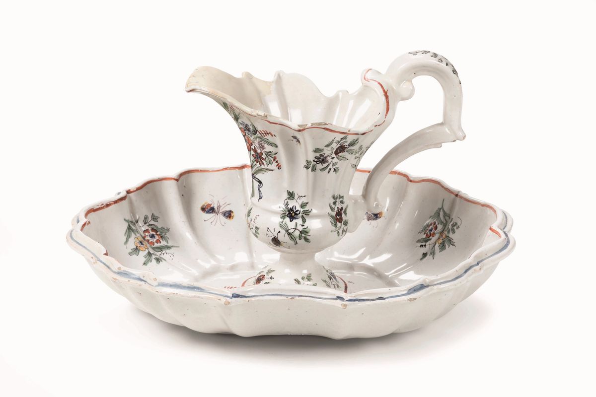 Insieme composto da due pezzi, che possono essere uno complementare all’altro, con funzione di lavamani. Il presentatoio è a bacinella di tipo ovale, apoda, con parete a costolature convergenti verso il centro, segnato da una lieve sagomatura a pianta ovale, originariamente predisposto per ospitare il piede di una zuppiera.