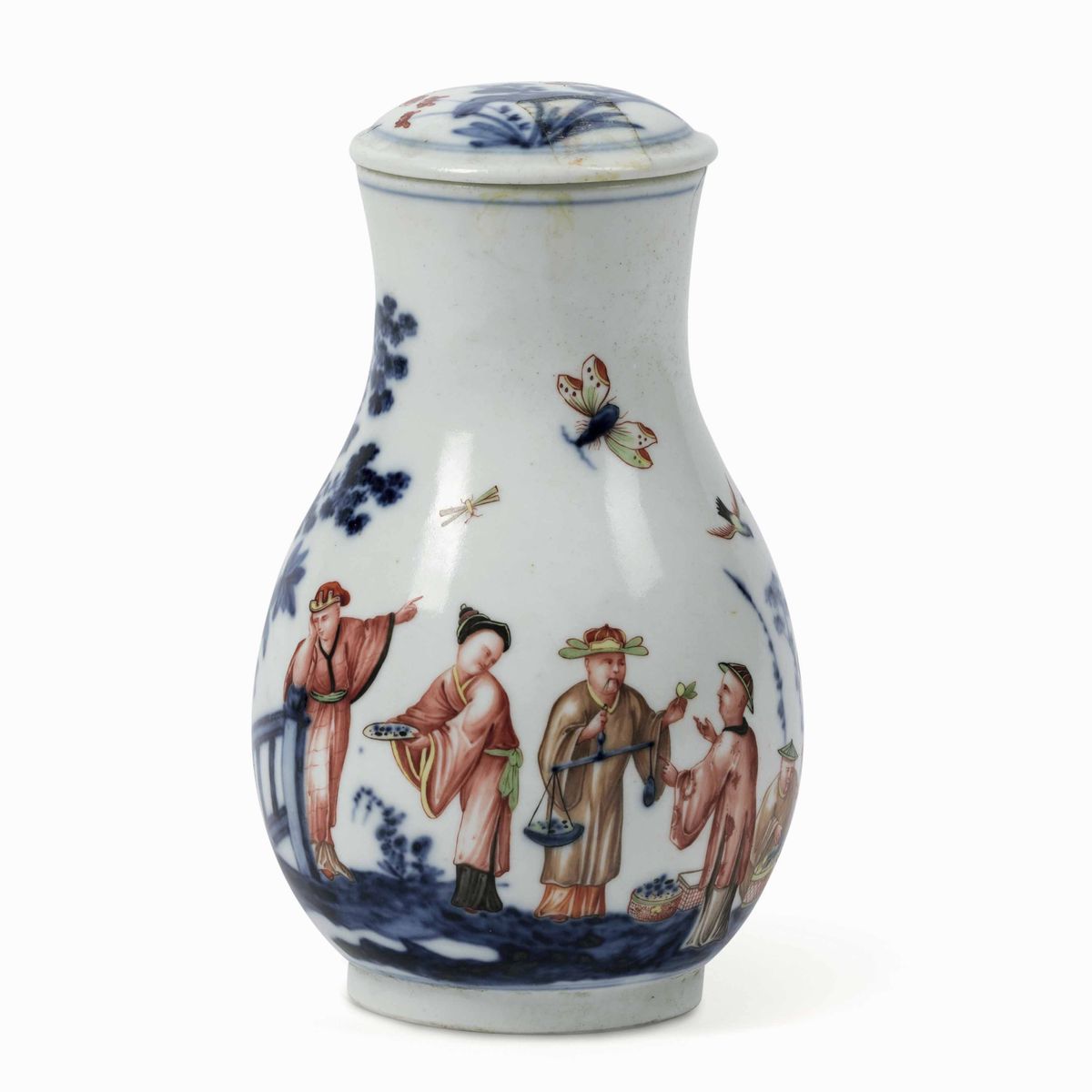 Il versatoio dal coperchio leggermente bombato è dipinto a cineserie policrome. Sopra al corto piede, su due linee in blu, poggia la decorazione che vede sette grandi cinesi policromi a piccolo fuoco in un paesaggio eseguito in monocromia blu a gran fuoco con rocce forate, balaustra, alberi ed arbusti fioriti. Inoltre uccelli ed insetti in volo