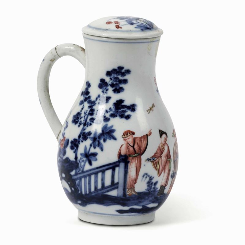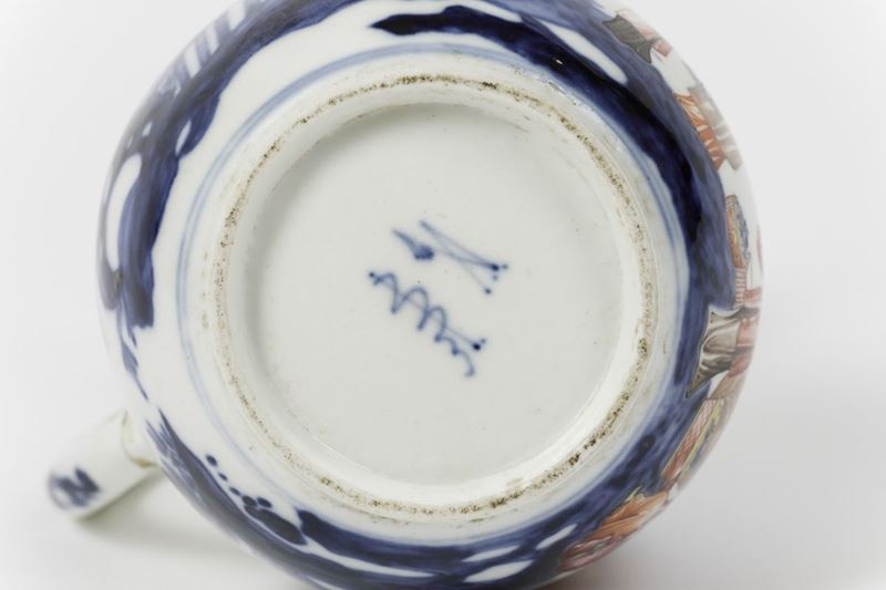 Porcellana. Marca: bastone d’Esculapio o caduceo in blu, accompagnato da una rarissima marca, forse una pseudo marca cinese. Altezza cm 17,8. Conservazione: manico rincollato; sbeccatura al bordo superiore