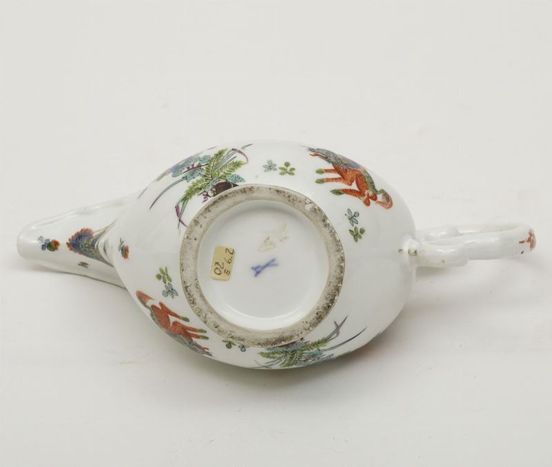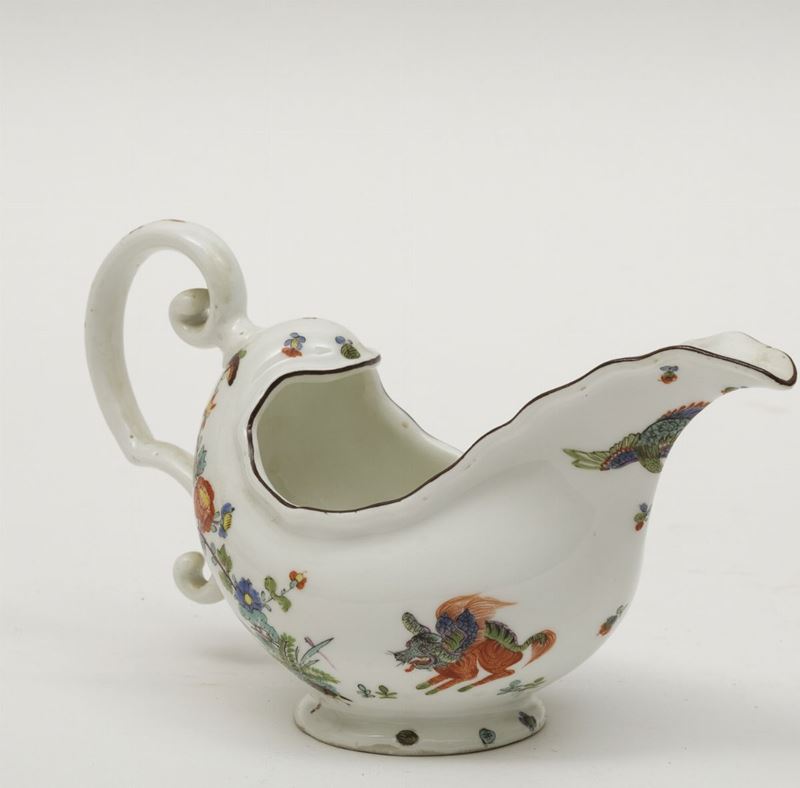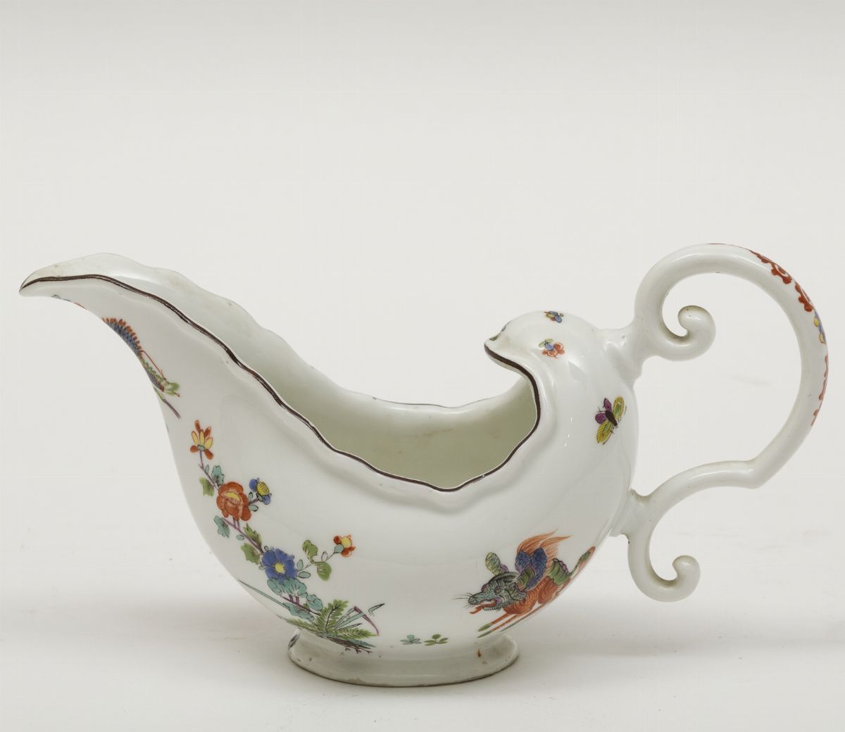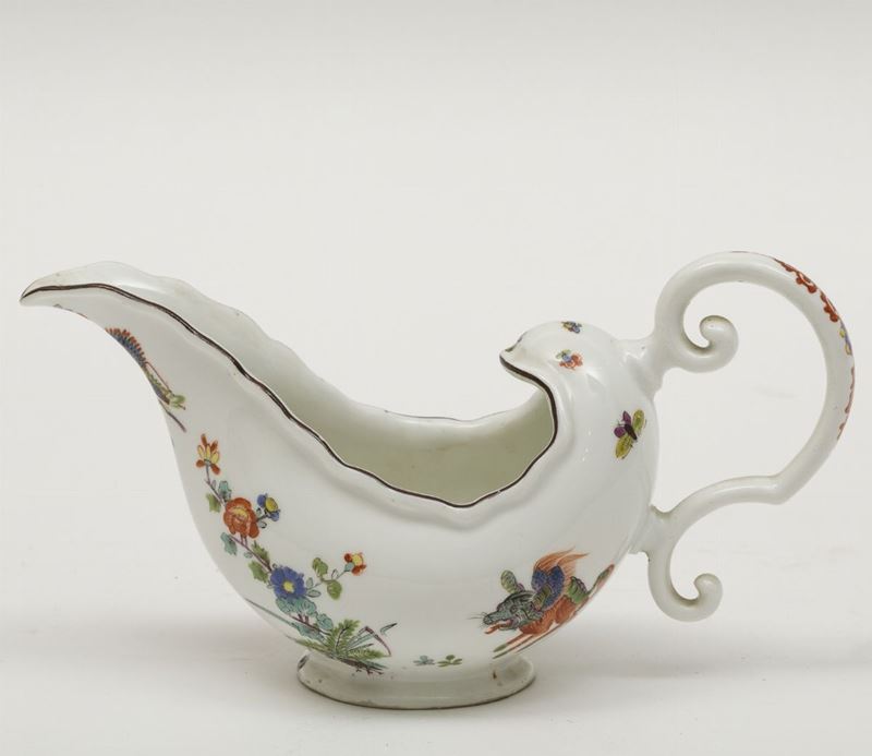 La salsiera dalla bella forma barocca è decorata in policromia con il famoso motivo detto “Geflügelten Drache” o “Koreanischer Löwe” che trae ispirazione dalle porcellane giapponesi Kakiemon. Un airone, un animale fantastico che deriva dall’incrocio tra un drago e una tigre, una pianta fiorita con un maggiolino e inoltre ramoscelli di “Indianische Blumen” - ossia fiori orientali - e farfalle sparsi decorano la superficie esterna e sono dipinti in policromia