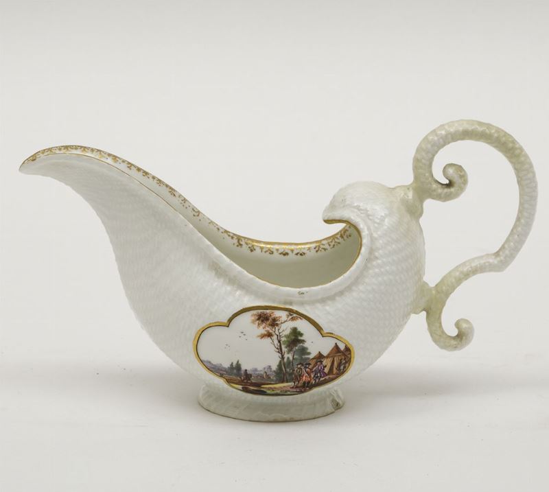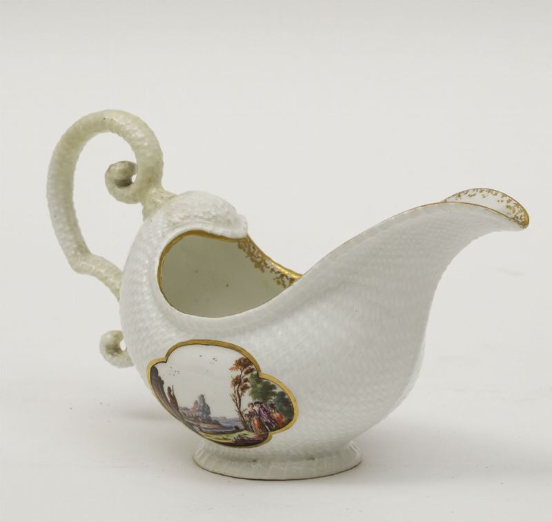 La salsiera, dall’armoniosa forma panciuta e manico a voluta, ha la parete esterna a rilievo come un canestro di vimini intrecciato escluse le due riserve sui due lati che sono lisce. Queste, quadrilobate e incorniciate da una profilatura in oro e nero, ospitano scene animate in paesaggi sassoni in policromia. In una troviamo dei soldati davanti a un accampamento con tende e nell’altra una nobile famiglia a passeggio e di lato un monumento. Al bordo interno nastro a rocailles vegetali stilizzate in oro
