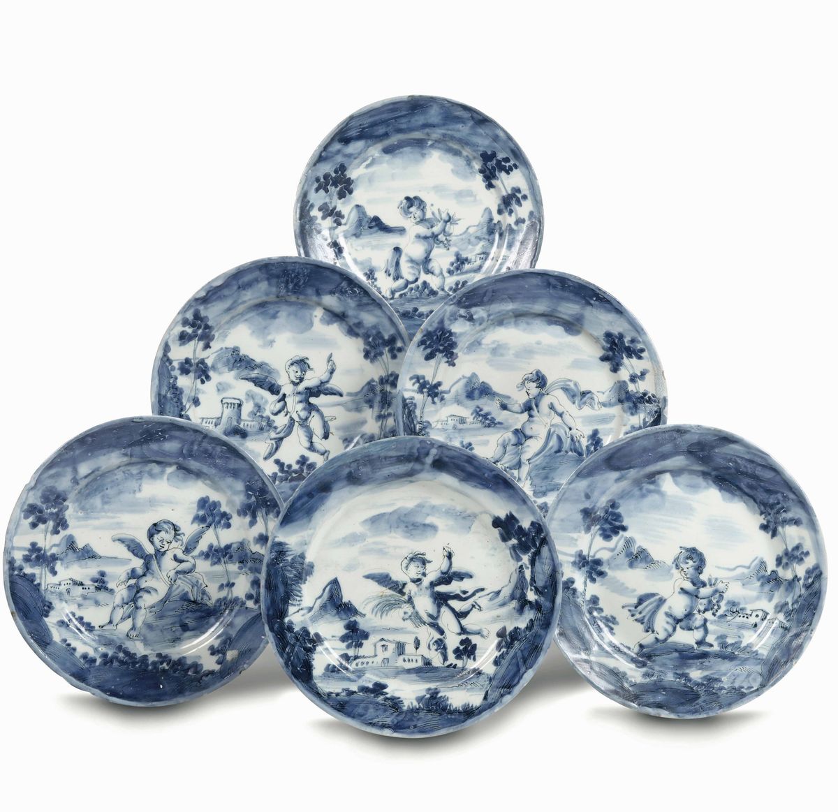 Sei piatti tondi di maiolica fine decorata, in monocromia di cobalto blu, con figure di putti danzanti tra sottili alberelli, in un paesaggio. Il retro vede una rapida serie di pennellate che riprendono la corona fogliata e al centro lo stemma di Savona accompagnata dalla lettera “V”.